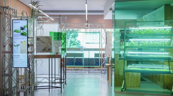 まだ国内では流通の少ないマイクログリーンを多くの人に知ってもらえるようにと、夏休みに金沢に来た観光客や地元の方が多く行きかう、近江町市場の目の前に位置する「かなざわはこまち」に出店しました。外観は無機質なステンレスやアクリル素材に対し、実際のファームで使われているマイクログリーンの栽培装置やグリーンをディスプレイし、足羽山の店舗と同じく空間の対比も楽しめます。8月末日までの期間限定ポップアップストアです。