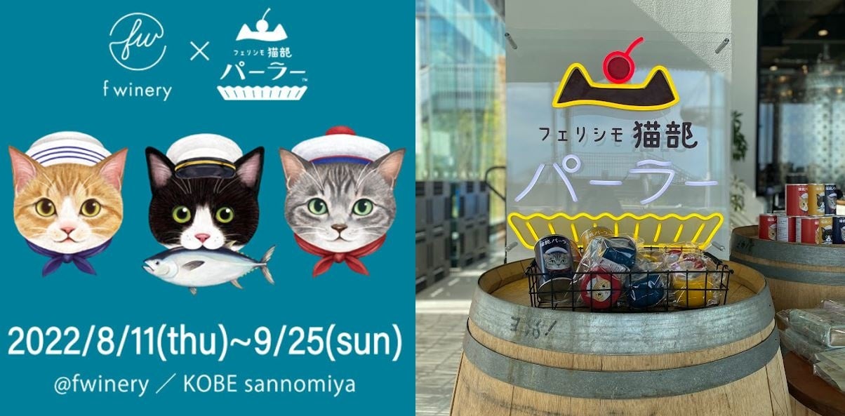 フェリシモが展開する都市型小規模ワイナリー「f winery[エフワイナリー]」と「猫部™」のコラボイベントを開催します。オリジナルラベルのワイン3種や缶入りチョコレート、パン、また缶バッチが入ったミニ缶などのグッズが、ワイナリーのスタンドエリアにて8月11日(木)から9月25日(日)までの期間限定で販売します。港に近い場所にある「f winery[エフワイナリー]」と、「猫部™」の船員猫さんとの初コラボとなります。「猫部パーラー™」とのコラボメニューは、ワインとのマリアージュセットやショコララテなどのノンアルコールドリンクもあります。オリジナルラベルワインは8月18日よりフェリシモウェブサイトにて販売します。商品の売り上げの1%は犬猫の保護と里親探し活動、猫の過剰繁殖防止活動を支援する基金「わんにゃん支援活動」に寄付されます。