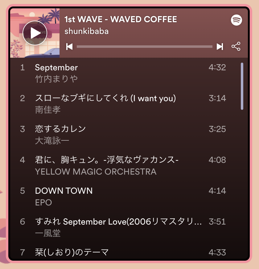 ミルクと合わせてもコーヒー感が強く出る、ダークチョコを思わせる深煎りのブレンド(ブラジル・コロンビア・インドネシア)。プレイリストは2000年前後の活気がありつつ哀愁のあるポップス・ロック。