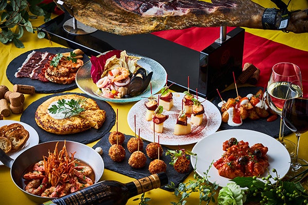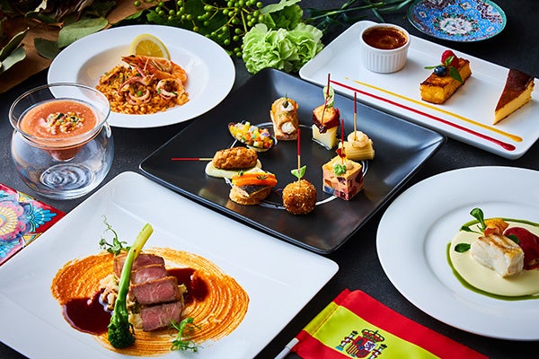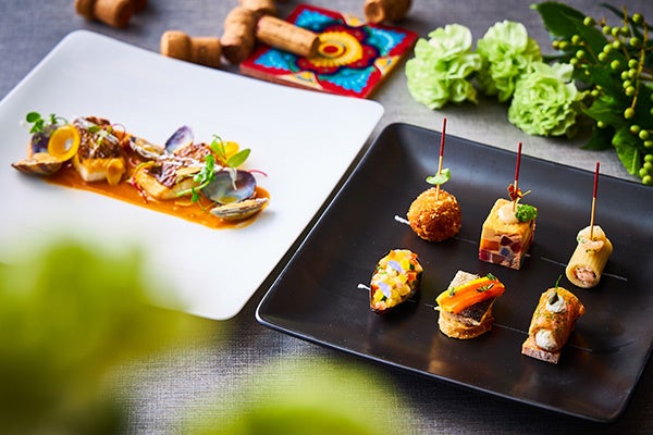 スペインと言えば誰もが連想するピンチョスやタパスをディナーコースでは8種の盛り合わせで、ランチコースでは6種の盛り合わせでご提供いたします。なかでも料理長おすすめの“ハモンクロケッタ”は生ハムの塩味とクリーミーなソースの相性が良い思わず笑みの出てしまう逸品。スペイン風オムレツ“根菜のトルディージャ”は彩りあふれる目にも美しい仕上がりです。スペイン風冷製トマトスープ“サルモレホ”は飲むサラダと言われているアンダルシア地方の一品や、サルスエラ(ブイヤベース)で炊いた“カタルーニャ風魚介のパエージャ”をホテルらしい盛り付けにてご提供します。