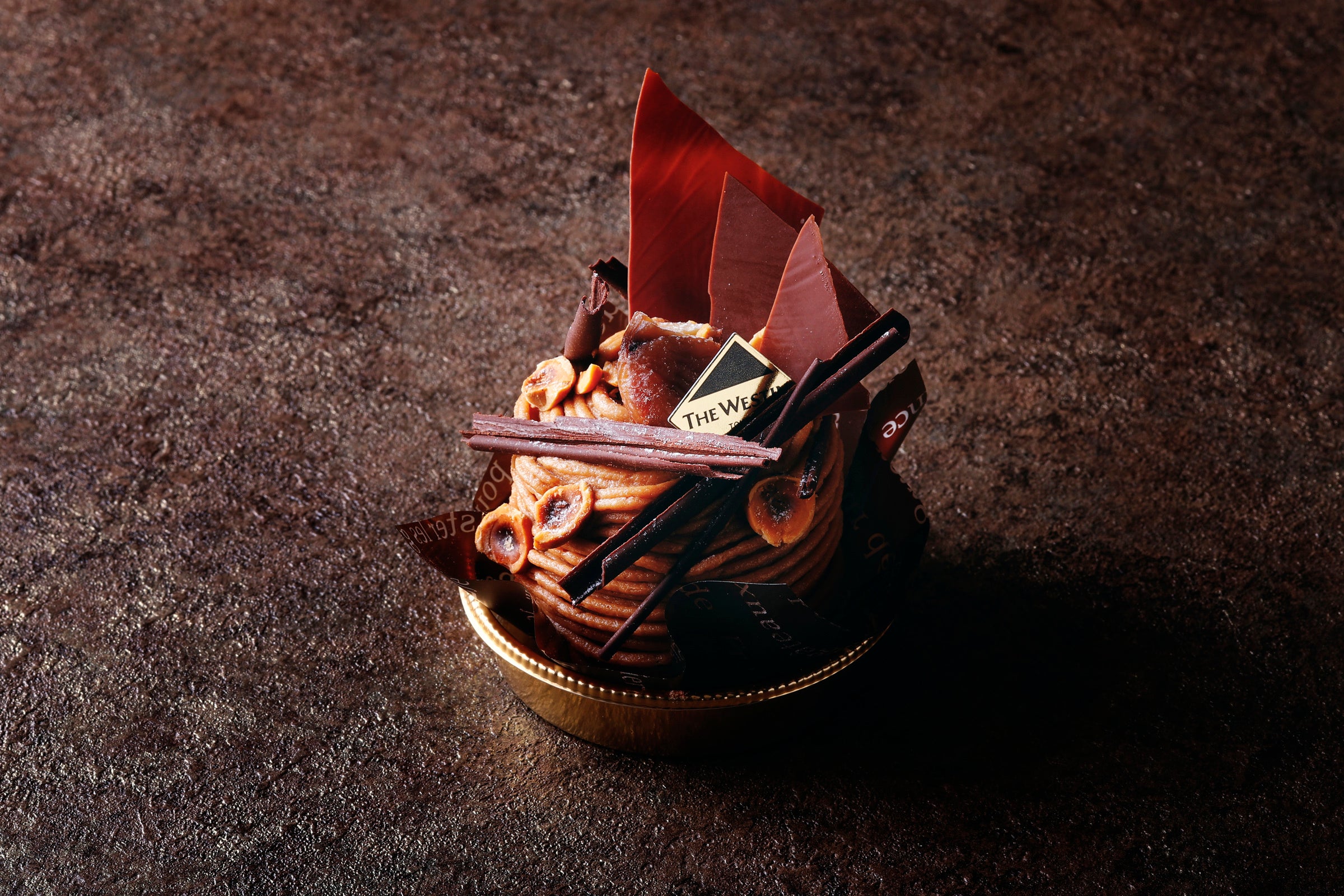 軽やかなヘーゼルナッツのシュクセの上に、チョコレートクリームを重ね、さらに濃厚な栗とヘーゼルナッツのクリームを絞りました。トッピングにはチョコレートとローストしたヘーゼルナッツを。栗の風味にチョコレートの甘さやナッツの香ばしさが重なりあう濃厚な味わいながら、軽やかな食感で絶妙なバランスに仕上げたモンブランです。
