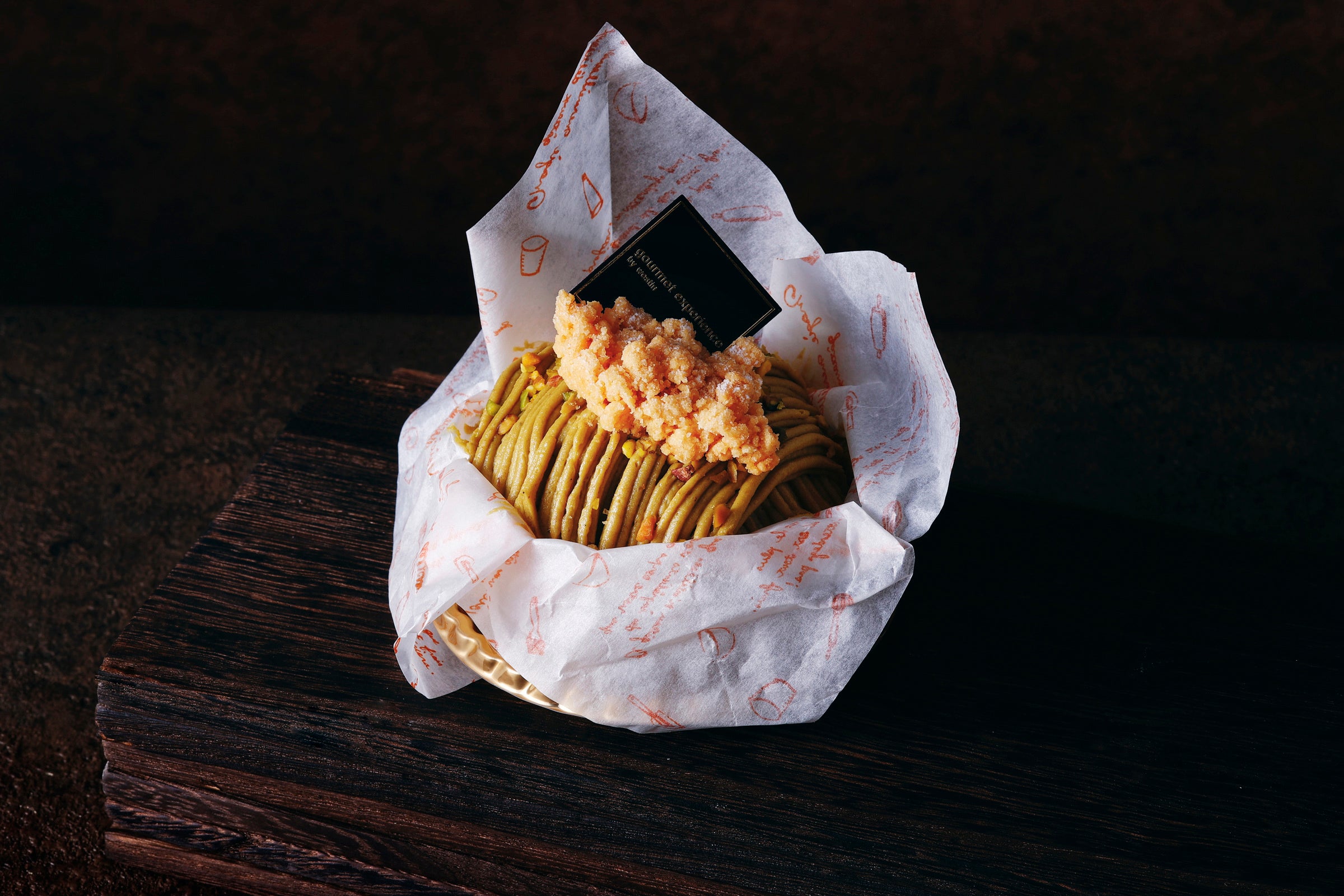 ローストピスタチオを加えたメレンゲの上に、キルシュ香るホワイトチョコレートとピスタチオのムースをドーム状に載せました。中にはしっとりなめらかなピスタチオクリームを忍ばせています。トップはマロンとピスタチオのクリームで濃厚に仕上げ、クランブルとローストピスタチオを。香ばしいローストピスタチオのペーストと、バタークリームに合わせたマロンの2つの風味が濃厚なハーモニーを奏でます。栗とピスタチオ両方の魅力に酔いしれるモンブランです。