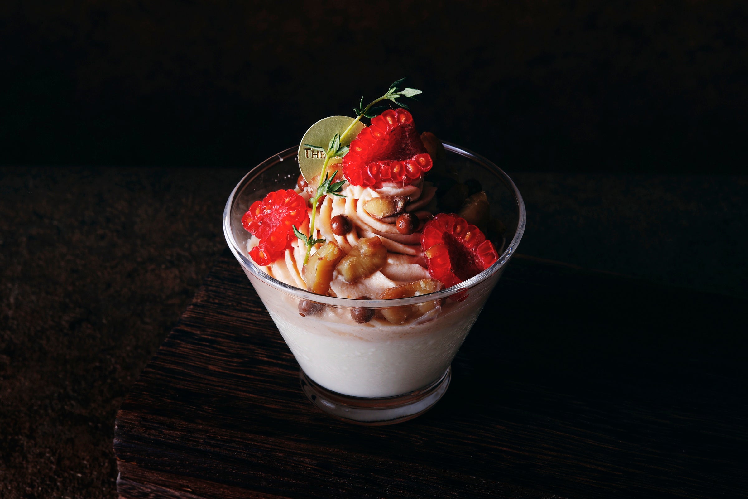 ラム酒が香り豊かなブランマンジェの上にまろやかな風味のマロンシャンティを絞ったグラススイーツ。フレッシュなラズベリーを添えて爽やかに仕上げました。優しい秋のスイーツをお楽しみいただけます。