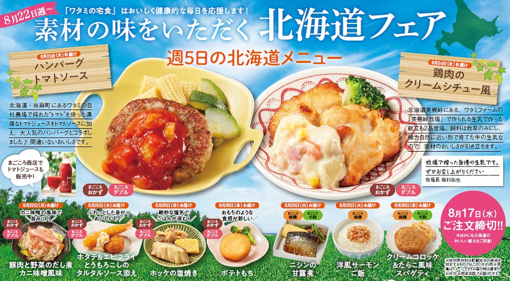 ワタミ株式会社(東京都大田区、以下ワタミ)は、食事宅配サービスを行う「ワタミの宅食」にて、8月22日週の5日間を「北海道フェア」と題し、北海道の特産物やグルメをイメージしたこだわりの献立で、お弁当・お惣菜を提供します。昨年度も5月に北海道献立を提供するご当地フェアを実施し、お客さまからは非常に好評を得ています。「ワタミの宅食」の塩分、カロリー、バランスに配慮したお弁当・お惣菜の形態はそのままに、おうちにいながら北海道の旅気分を味わえる5日間となっています。