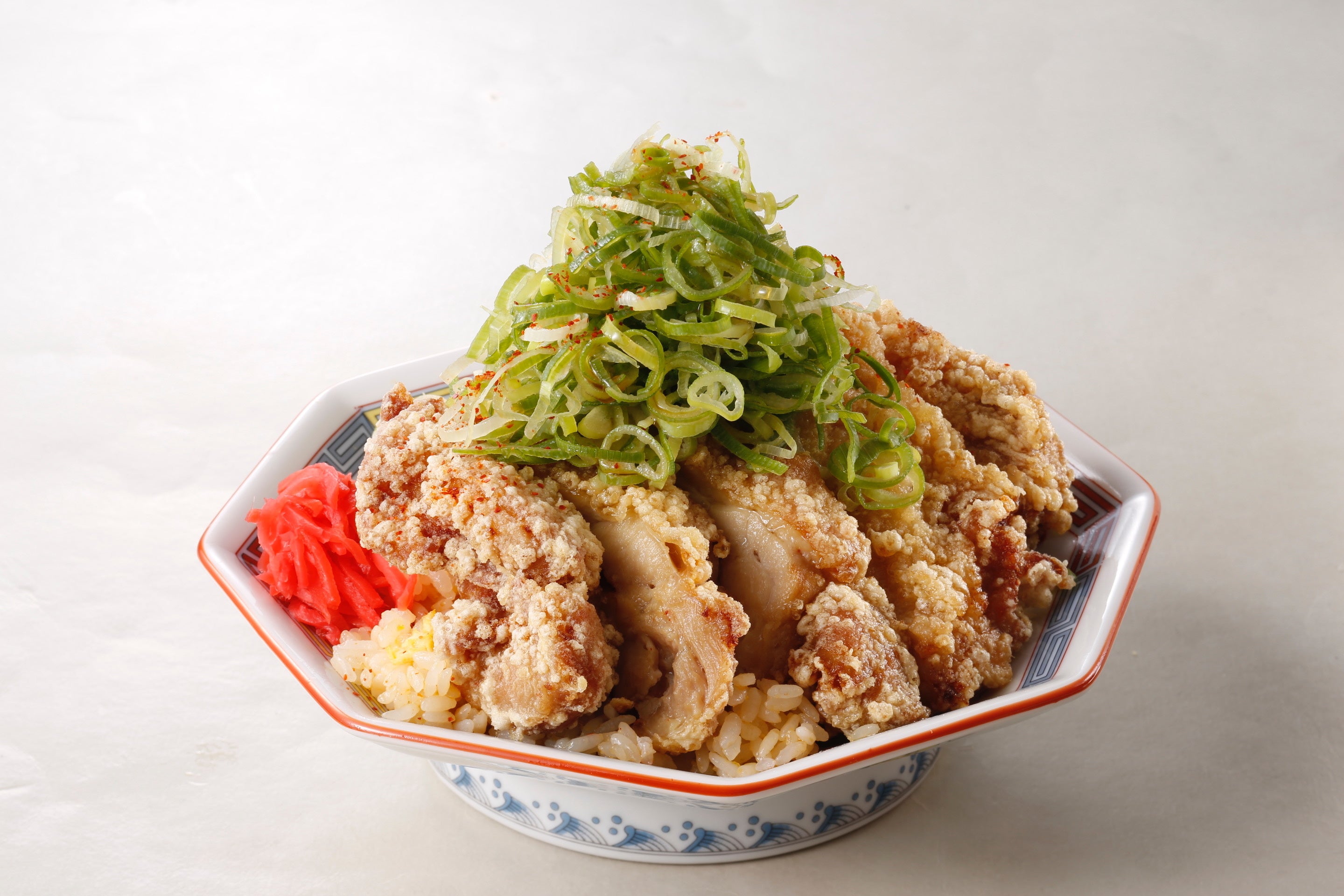 ・商品説明:大判の鶏もも肉をにんにく、生姜を効かせた醤油ベースのタレに漬け込み、片栗粉をまぶして揚げた「山賊焼き」を、ほんのり豆板醤をきかせた卵チャーハンの上に豪快に盛り付けた一品。ザクザク食感の衣、ジューシーな肉とチャーハンが絶妙にマッチし、ボリューム満点です。