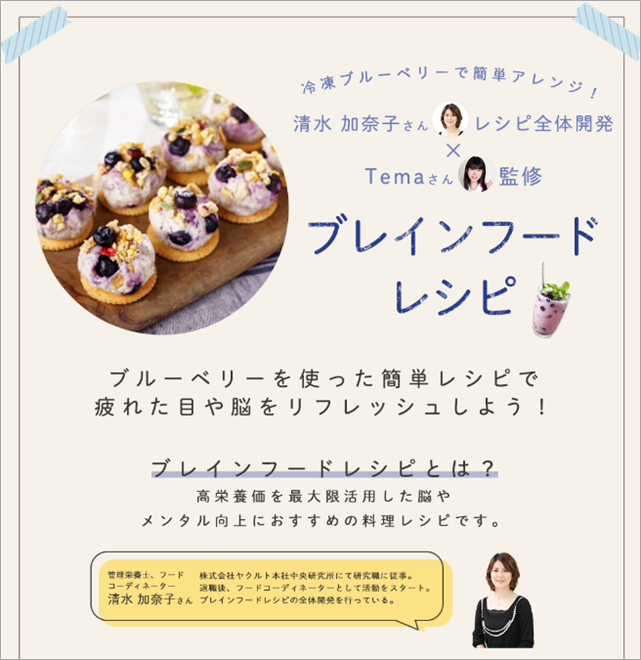 「Blueberry Life Lab」のレシピスペシャリストで、管理栄養士、フードコーディネーターである清水加奈子さんが開発した、ブルーベリーの高栄養価を最大限活用した脳やメンタル向上におすすめの料理レシピ「ブレインフードレシピ」を発表します。eスポーツ選手のTemaさんのアドバイス・監修を受けた、eスポーツにもうれしいレシピもラインアップしています。