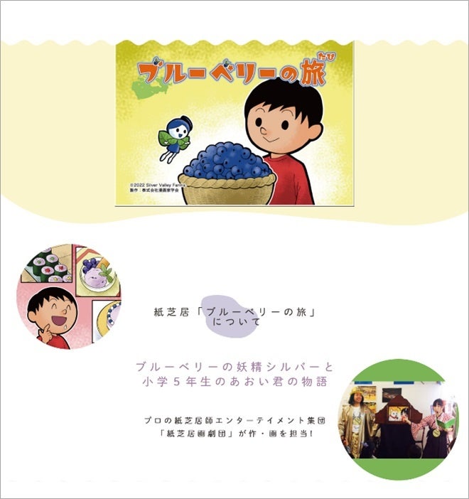 オリジナル紙芝居「ブルーベリーの旅」は、栽培の本場カナダで育つブルーベリーを妖精シルバーが紹介するもので、プロの紙芝居師エンターテイメント集団「渋谷画劇団」が、作・画を担当しています。妖精シルバーが教えてくれるブルーベリーの基礎知識は、大人の知識欲も満たしてくれる内容です。ブルーベリー栽培が盛んな北米カナダについて、ブルーベリーの実がなるまでの様子、収穫されたブルーベリーは味わいや栄養価を損なわず鮮度を保持された状態で冷凍され日本に送られているなど、ブルーベリーの情報をわかりやすく紹介します。サイト内で動画形式で見ることができます。