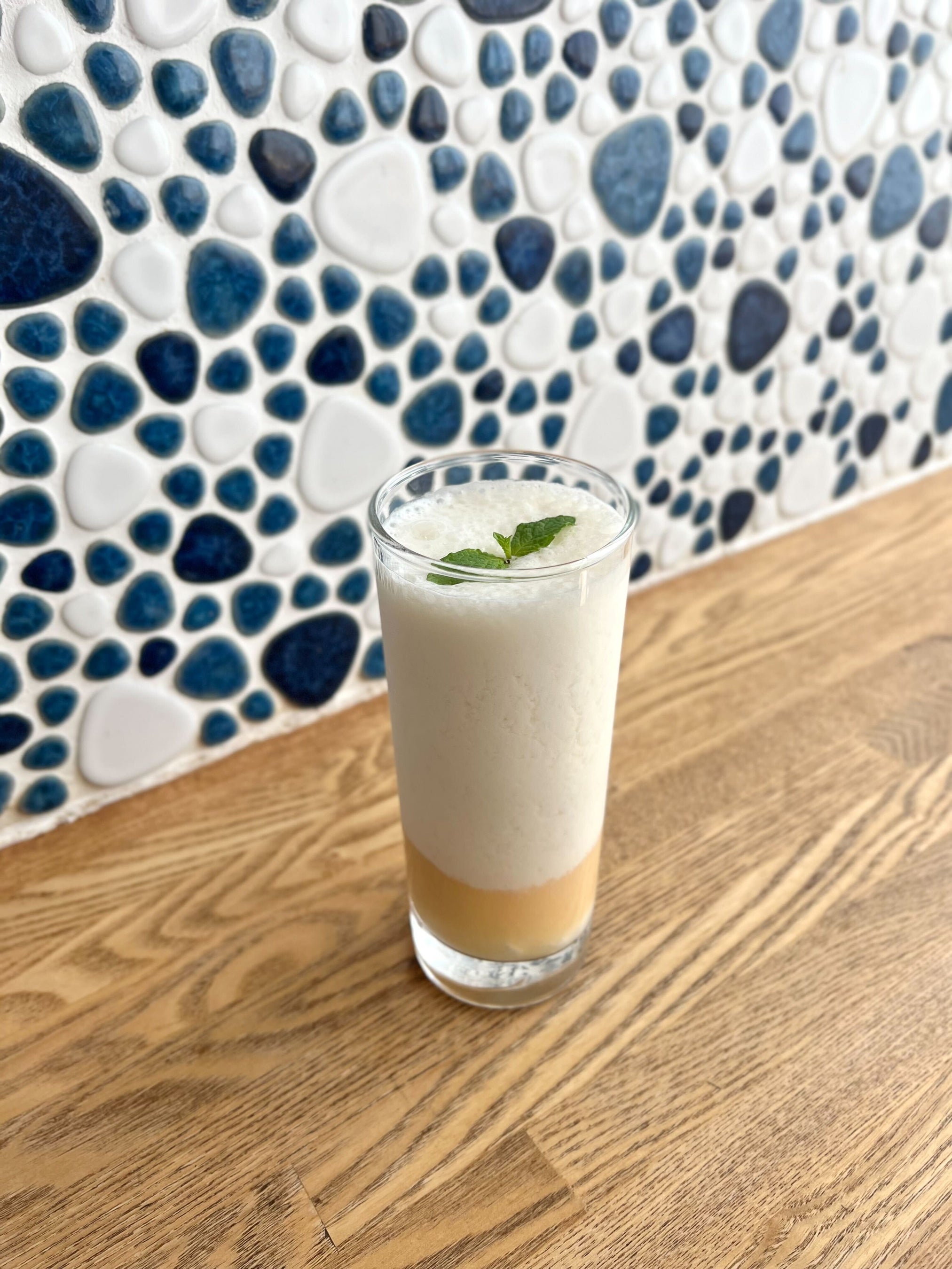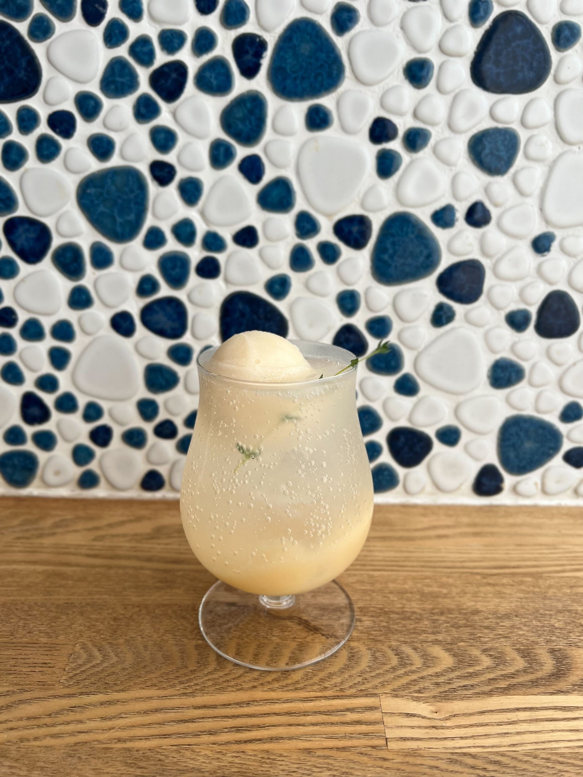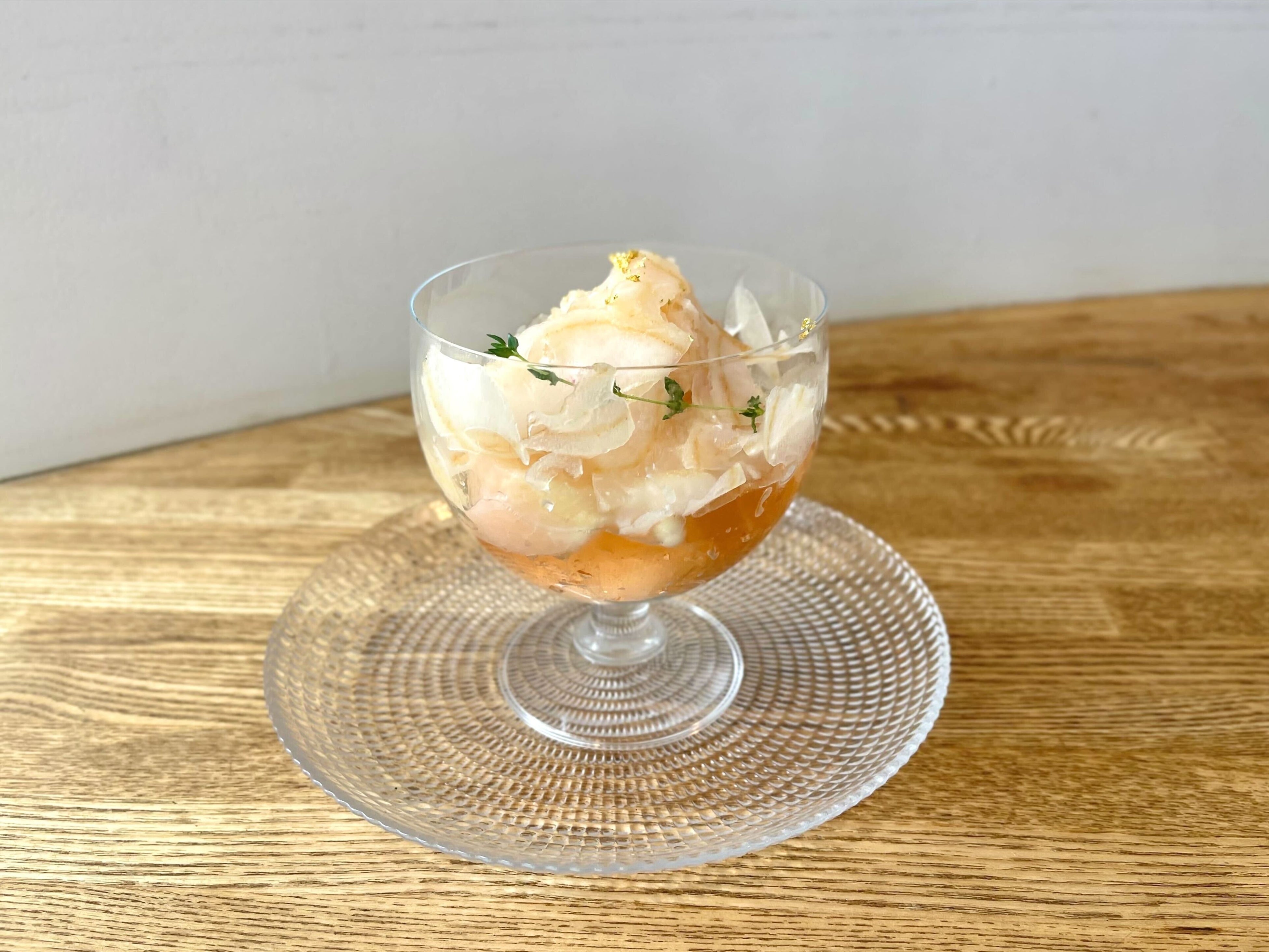 自家製の桃果肉をホワイトピーチシロップとソーダで割りました。白桃シャーベット、タイムをトッピング。ジューシーな桃の甘さと爽やかなソーダが夏にぴったりです。