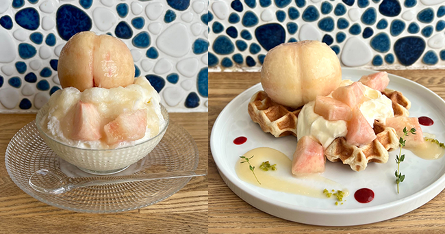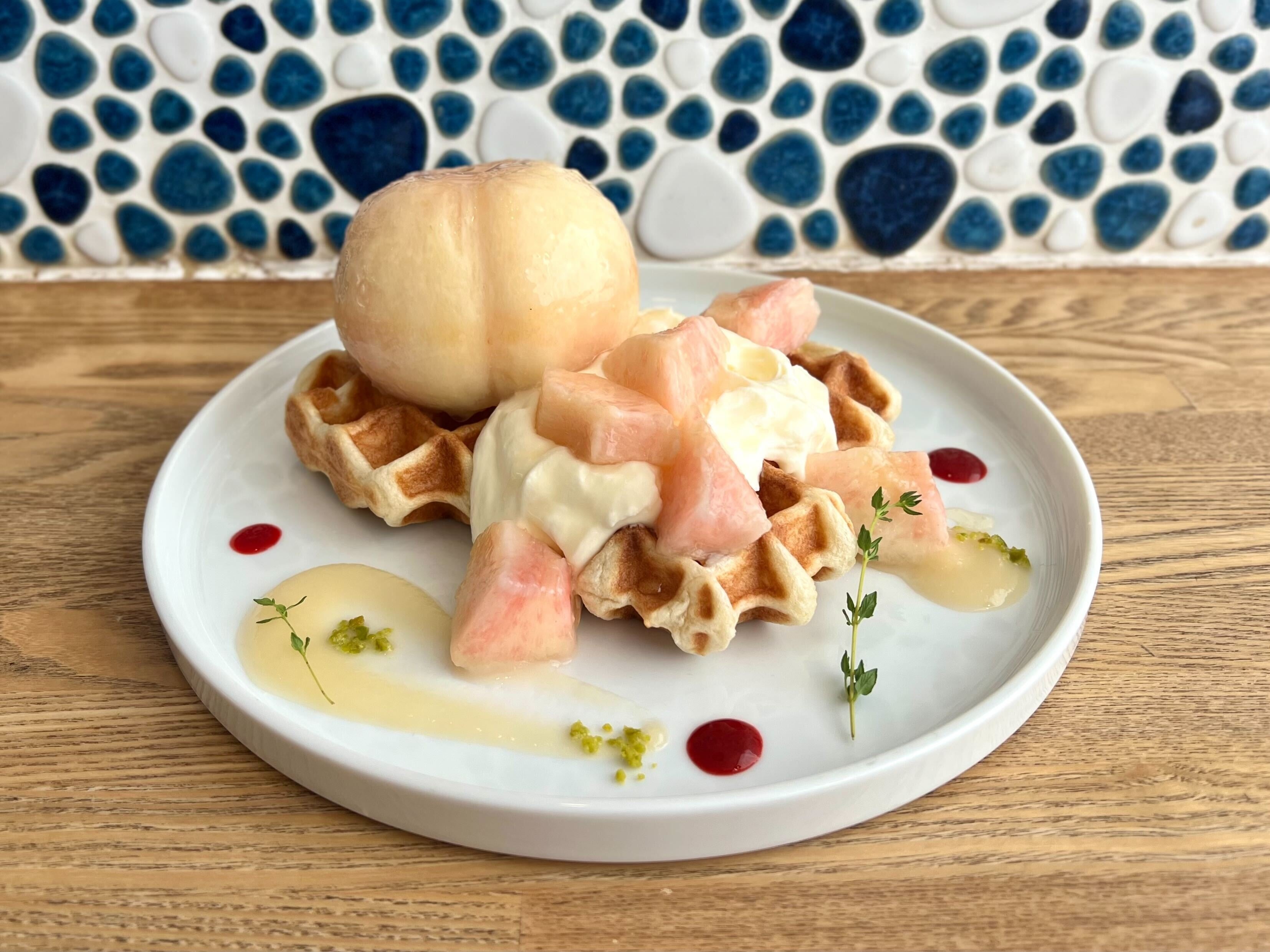 大人気商品「ムー」をワッフル型で焼き上げ、桃丸ごと1個、桃カット、桃クリーム、桃ソース、ピスタチオ、蜂蜜、ベリソースと合わせました。桃をまるまる1つ使用した贅沢な今の季節限定のワンプレート。