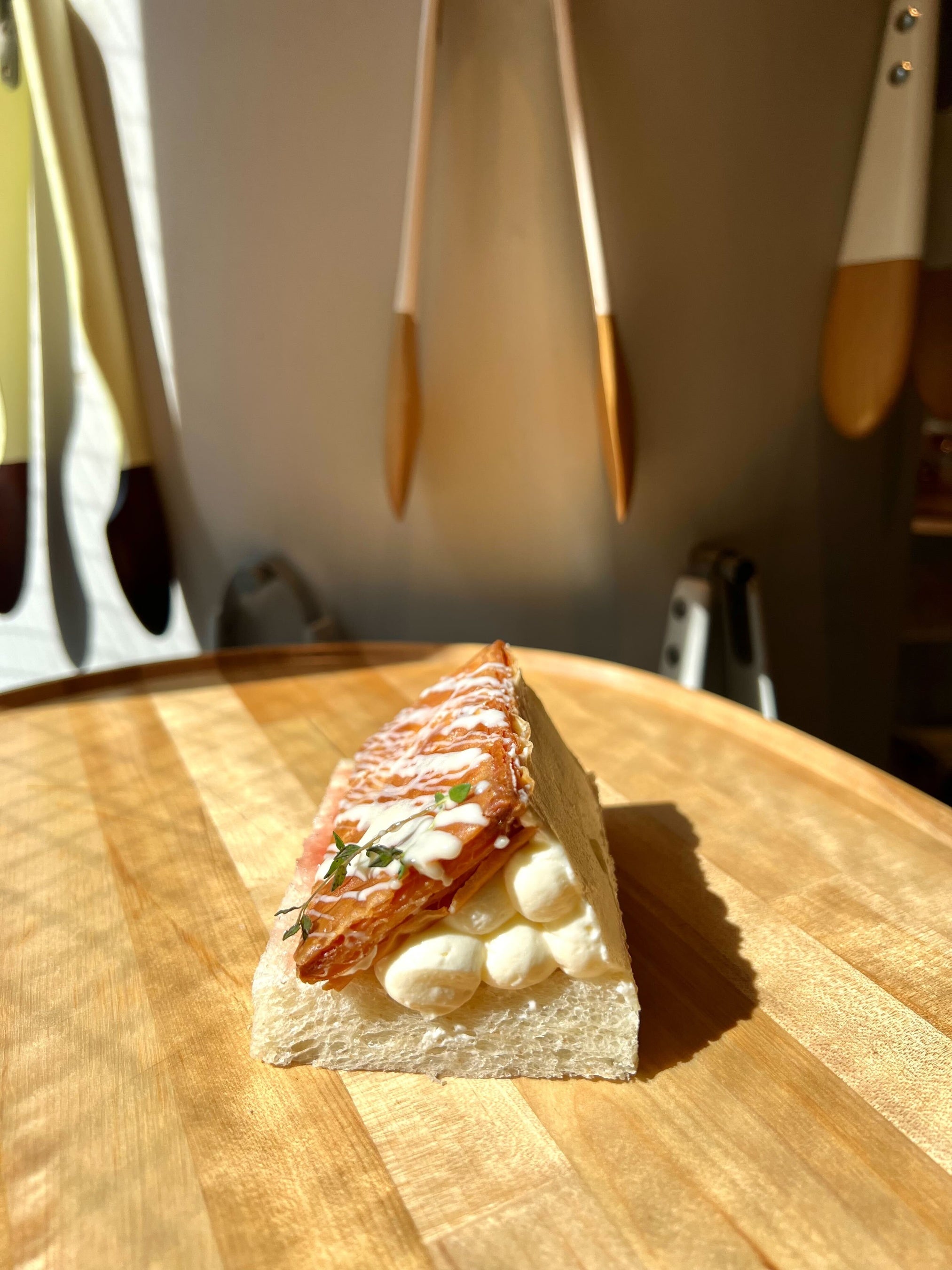 土台パンにはメープルマスカルポーネパンを使用し白桃とラズベリーのジャムの上には自家製桃のコンポートと桃クリームがたっぷりはいってます!