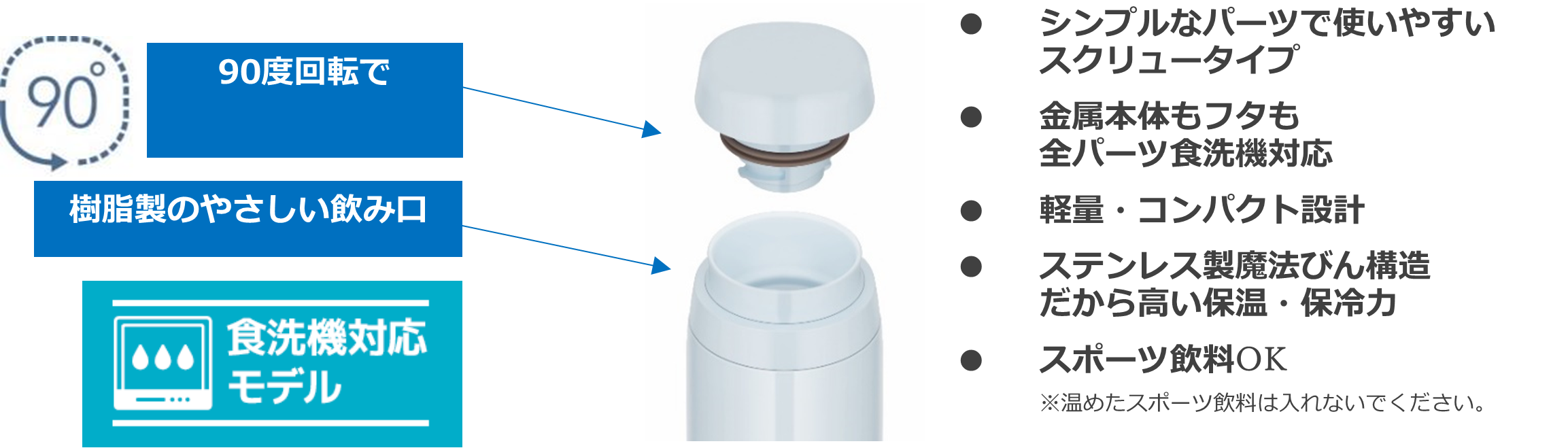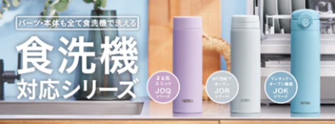 サーモスには90度回転でフタが開くJORシリーズの他、すみずみまで洗いやすい「まる洗ユニット」搭載のJOQシリーズ、ワンタッチ・オープンで片手でさっと飲めるJOKシリーズの3種類の食洗機対応ケータイマグがあります。