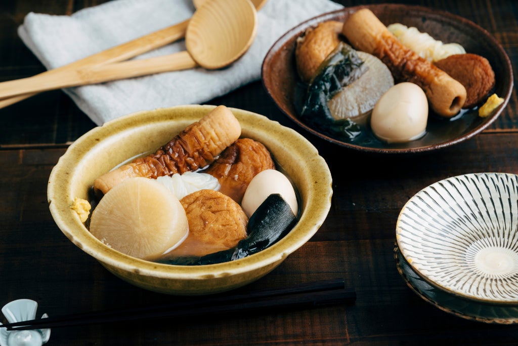 かつお節、宗田がつお節、サバ節をブレンドした出汁に地鶏エキスを加えたコクのある濃厚な味わい。大根・卵・ちくわ・結び白滝・結び昆布・がんもどき・さつまあげが入っています。