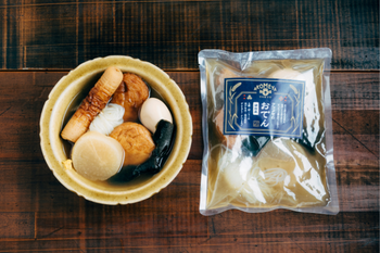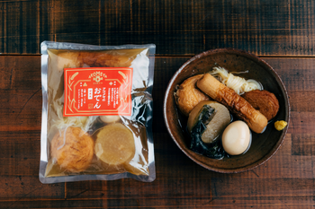 かつお節、宗田がつお節、サバ節をブレンドした出汁に地鶏エキスを加えたコクのある濃厚な味わい。大根・卵・ちくわ・結び白滝・結び昆布・がんもどき・さつまあげが入っています。