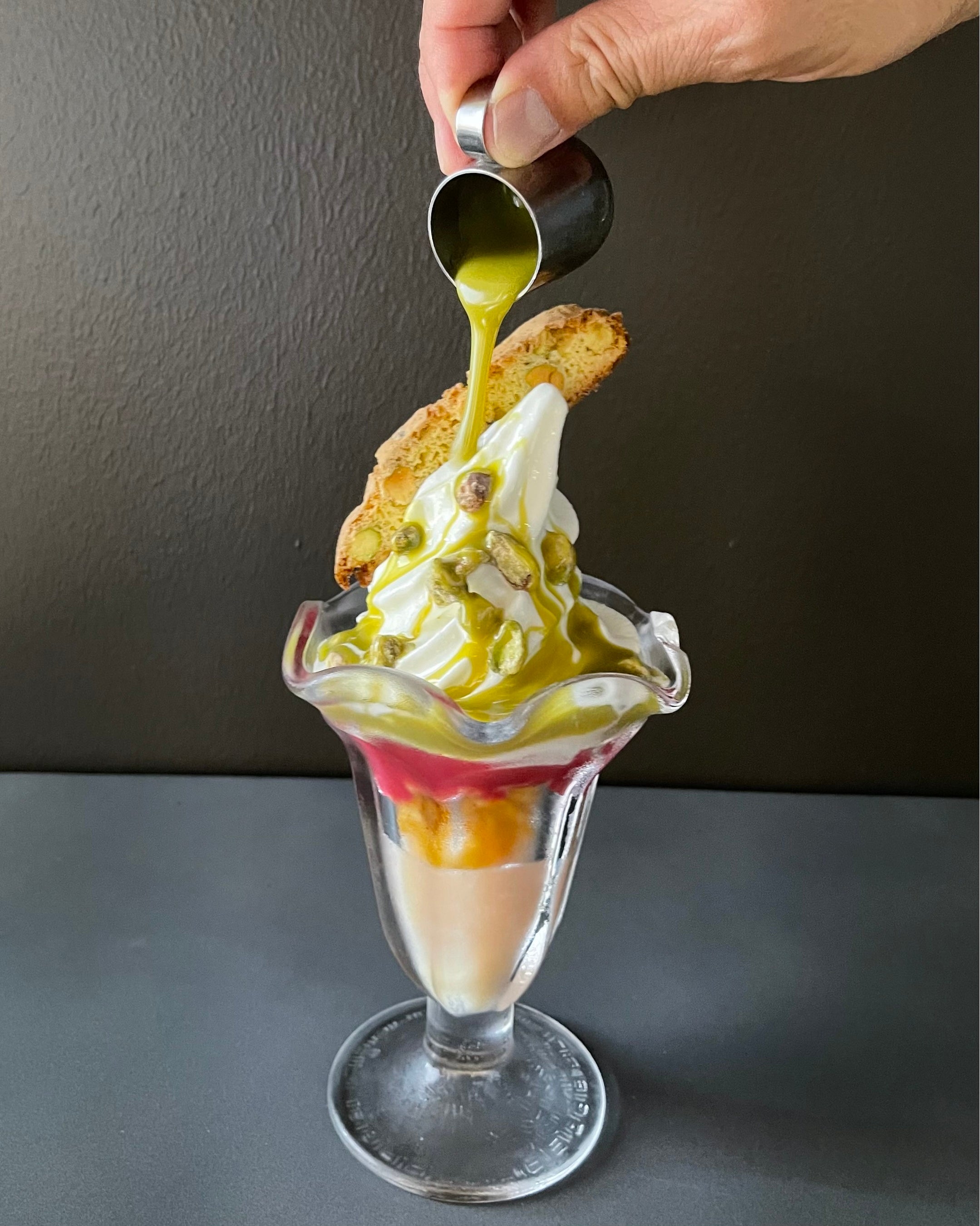 ■ 内容(下から):桃のコンポート/コーンフレーク/赤桃のジュレ/ジェノワーズ/ピスタチオソース/ピスタチオクラックラン/北海道山中牧場生乳ソフト/自家製カントゥッチ