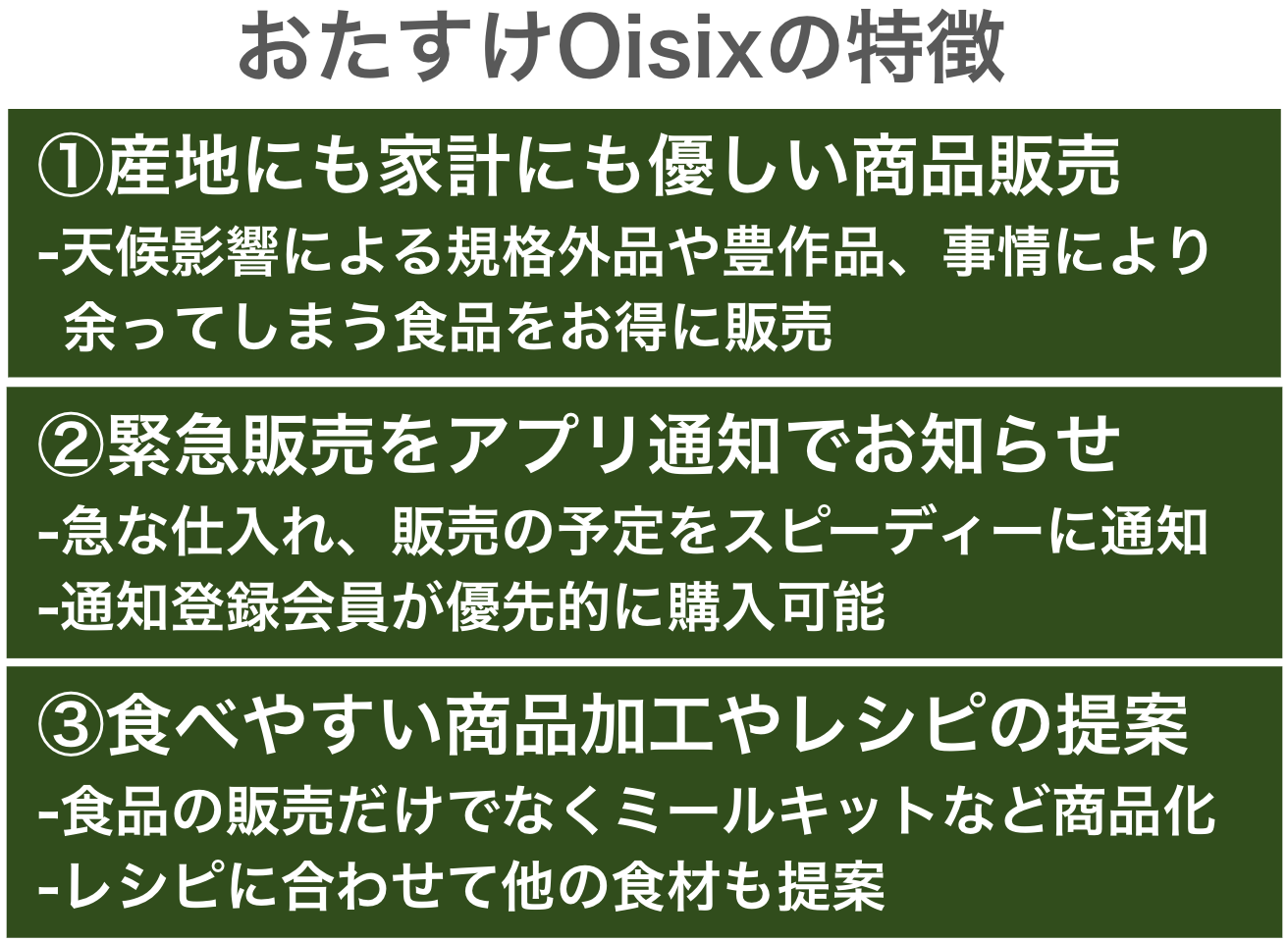 「おたすけOisix」は、産地と密に連携をしながら「もったいない」を減らし、お求めやすい価格とすることで、お客様の家計にも優しい継続的なサービスとして展開。希望する会員はアプリ通知で緊急販売情報を受け取ることができ、対象商品の購入により、販売価格の5%が次回以降の注文時に使えるポイントとして付与されます。
