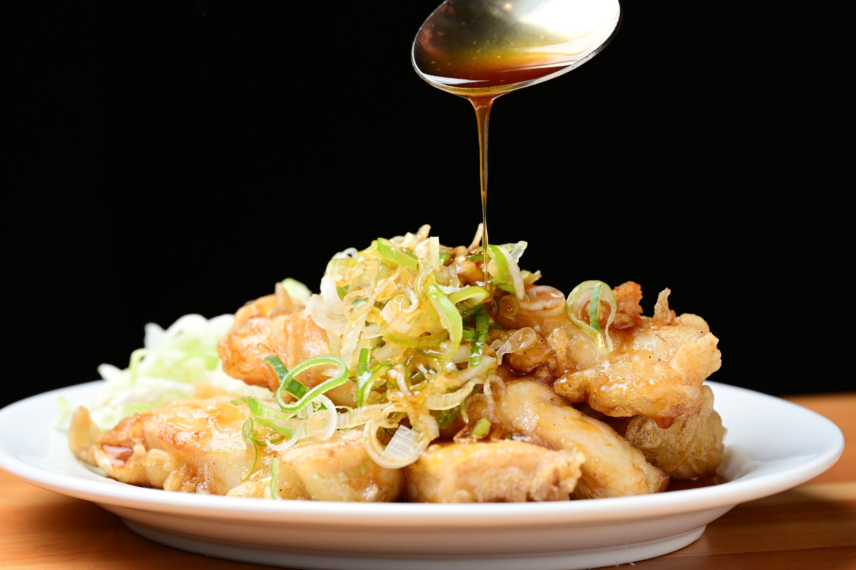 衣はもち粉と片栗粉をオリジナルで配合しサックサクの食感に仕上げ、黄金比率の甘酢に九条ネギをたっぷりと使用しました。添えてある瀬戸内産のレモンをしぼってさっぱりお召し上がりください。