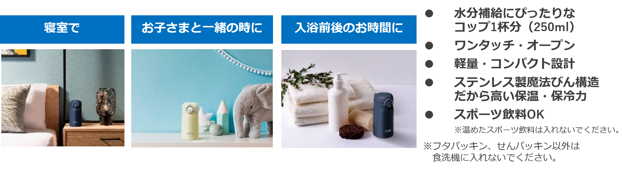 ケータイマグの主な使用シーンは外出時や職場・学校などですが、近年、“自宅での使用”が増加傾向にあります。家の中でも手元に水筒を置いておくことで、気軽に水分補給ができ、水分摂取量も把握しやすくなります。このたび、自宅での使用増加を受けて、ご自宅でも使いやすいコップ1杯分(250ml)の『サーモス 真空断熱ケータイマグ(JOP-250)』を開発しました。