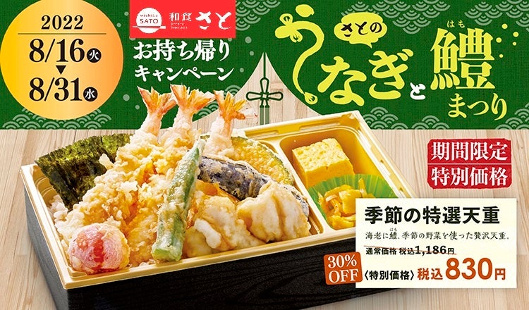 国内207店舗を展開する「和食さと」では、うな丼や鱧の天ぷらなど、テイクアウト限定のキャンペーン「さとのうなぎと鱧まつり」を、8月16日(火)から8月31日(水)までの期間限定で開催します。
