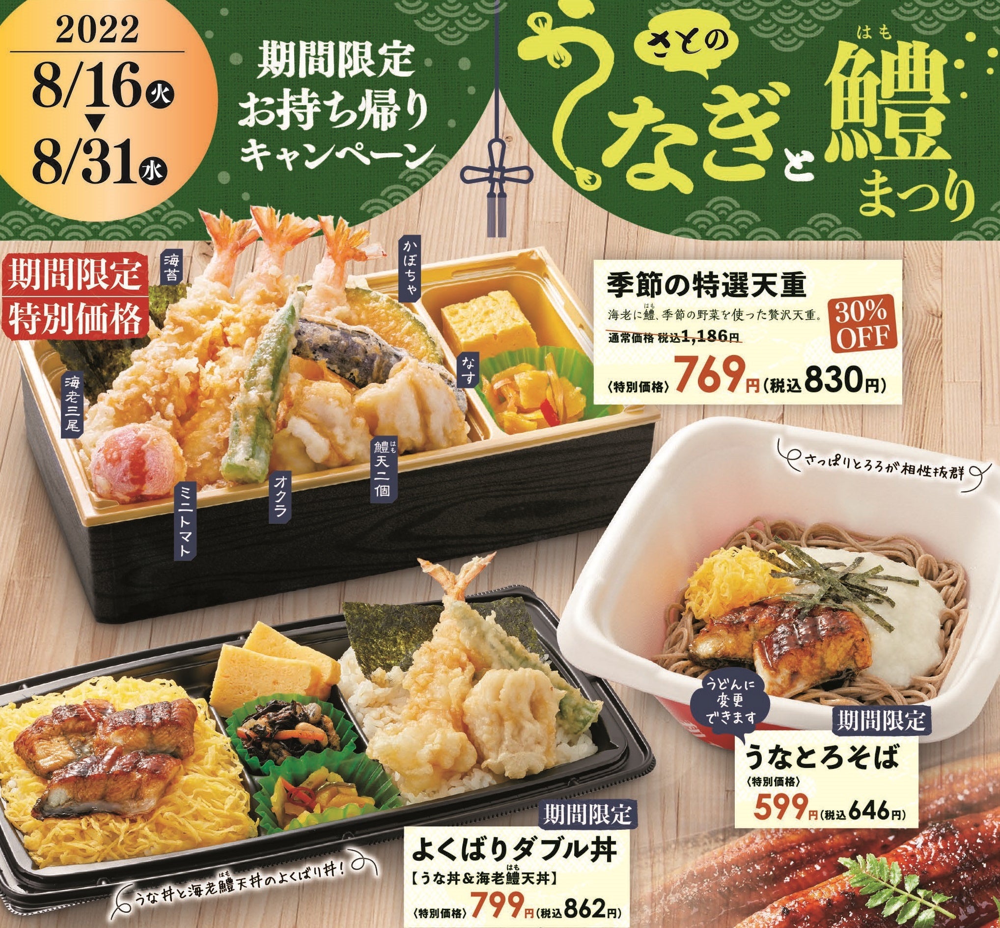 国内207店舗を展開する「和食さと」では、うな丼や鱧の天ぷらなど、テイクアウト限定のキャンペーン「さとのうなぎと鱧まつり」を、8月16日(火)から8月31日(水)までの期間限定で開催します。