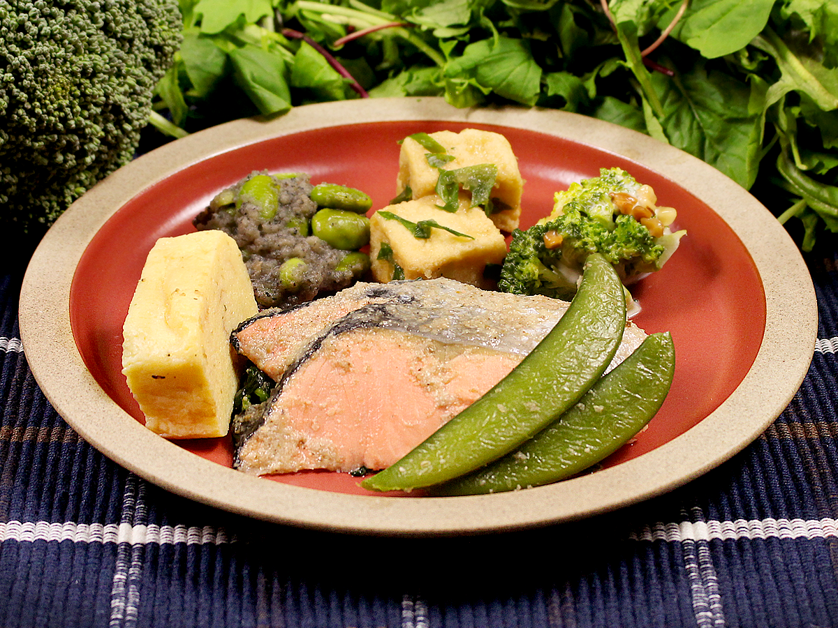 小ぶりの銀鮭にすりごまと塩胡椒をまぶし焼き上げました。かつお出汁をあわせたほうれん草、スナップエンドウ、しっかりとした甘さのある厚焼きたまごを添えております。全体的にあっさりとお召し上がりいただけるため朝食にもぴったりのメニューです。
