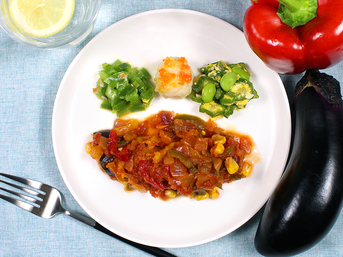 夏に食べたくなる爽やかで濃厚なラタトゥイユが仕上がりました。野菜と大豆ミートで作ったベジボールを使用しており、食べ応えは十分です。ベジボールはほろほろとした食感でお豆腐を想像させます。旬の夏野菜と一緒にお楽しみください。