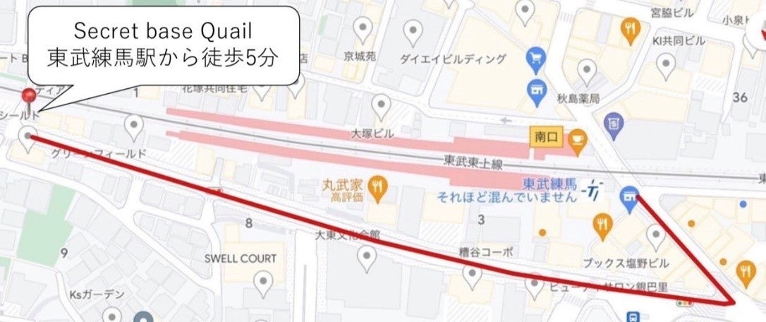私たちの拠点となるカフェ『Secretbase Quail』(シークレットベース クウェイル)は、板橋区の徳丸1丁目にあり、東武練馬駅から徒歩5分とアクセスしやすい場所になっています。(住所:東京都板橋区徳丸1丁目7-12)
