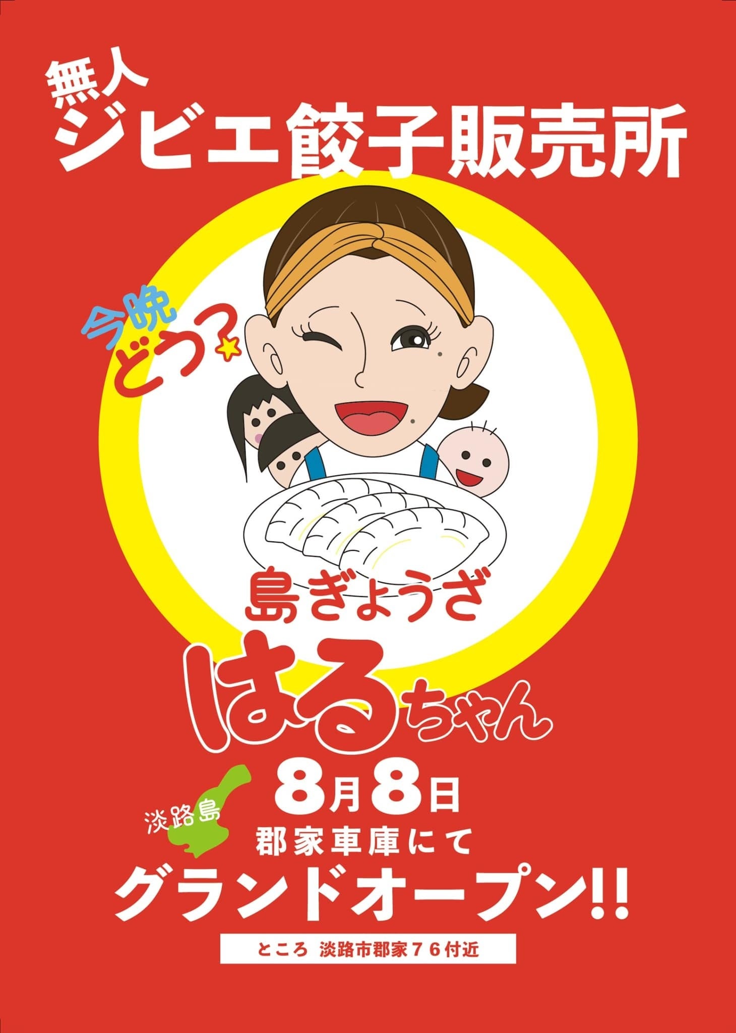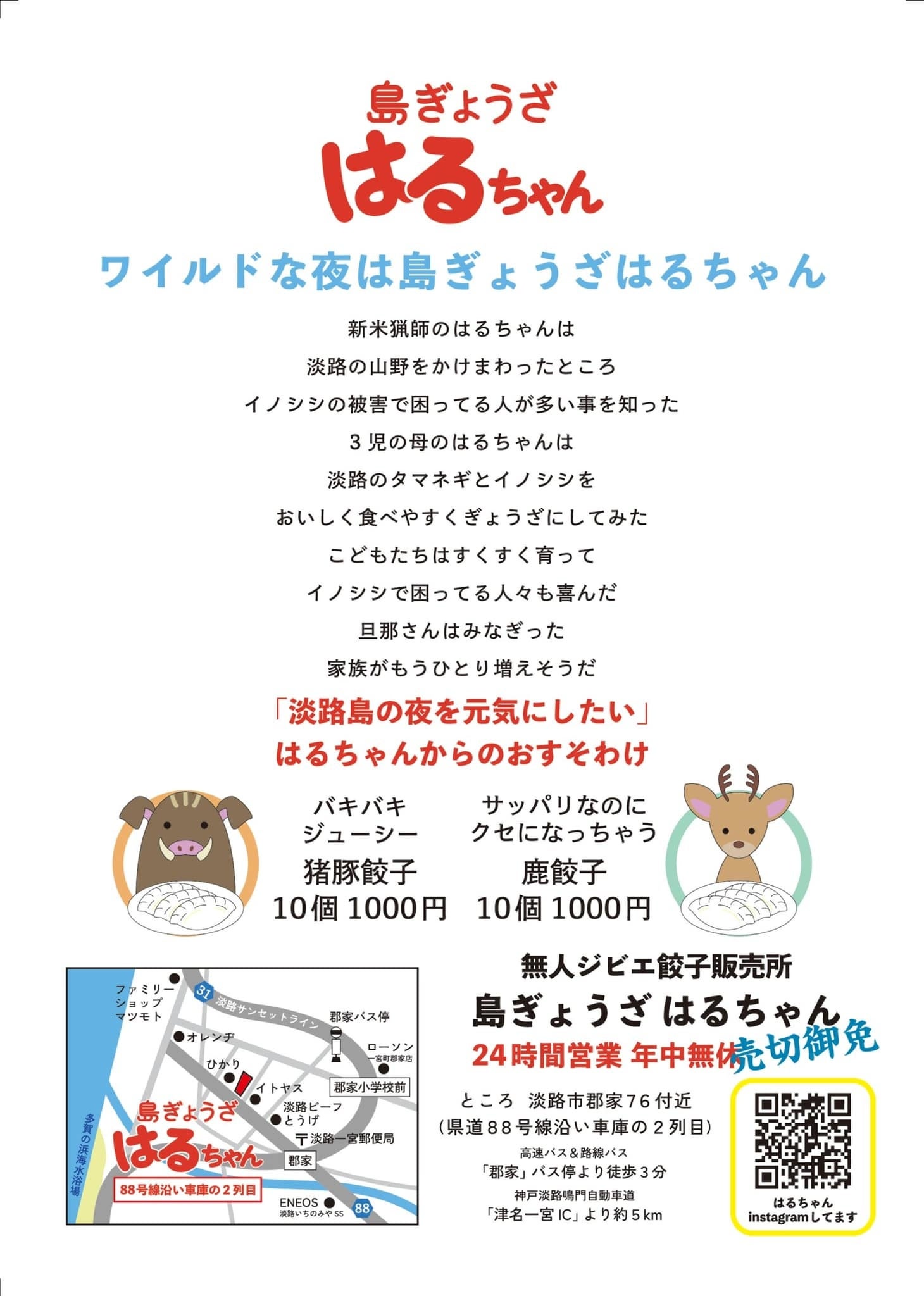 2022年8月8日、 兵庫県淡路島郡家の車庫にて無人ジビエぎょうざ販売所「島ぎょうざはるちゃん」がオープンしました。 ジビエとタマネギを詰め込んだぎょうざと独特な内装。 「今晩どう?」が合言葉。