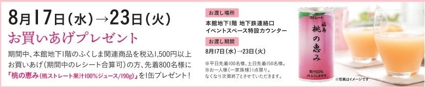 8月17日(水)から8月23日(火)まで松坂屋上野店本館地下1階 ほっぺタウン(鮮魚・精肉・青果・グローサリー・和洋酒売場)にて美味しいふくしま食品を販売いたします。各日先着で「桃の恵み(桃ジュース)1本」のお買い上げプレゼントもありますので、みなさまのご来館をお待ち申し上げます。