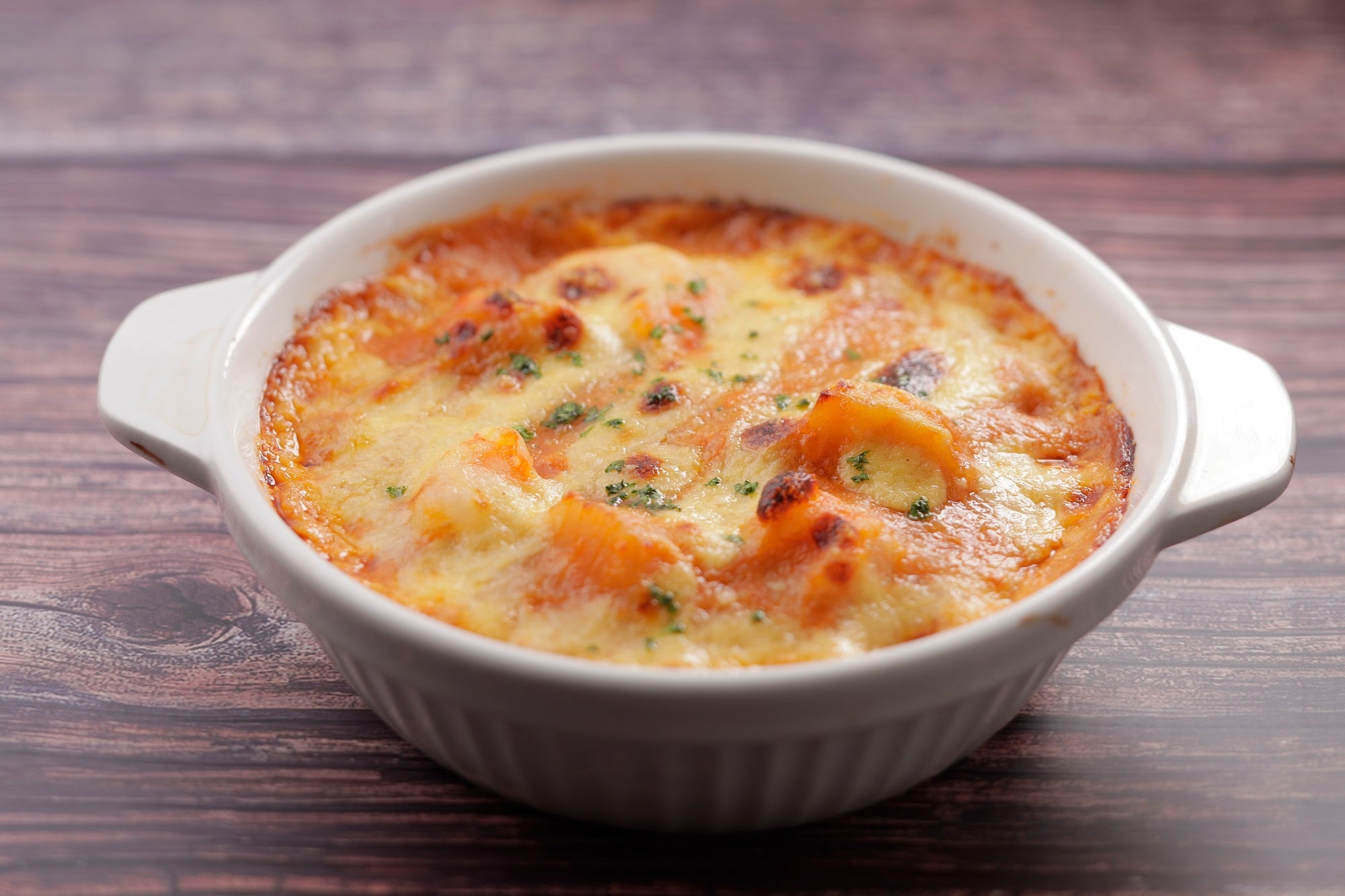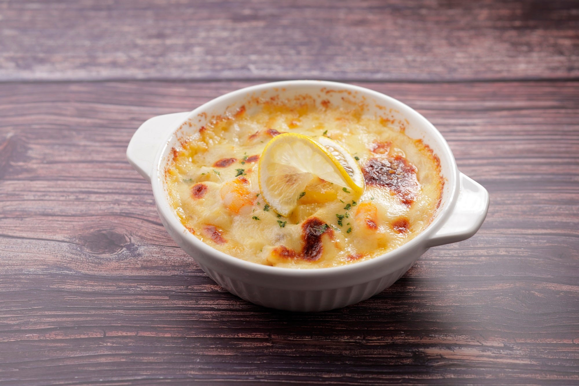 バターライスの上に海老、小柱をのせて濃厚なアメリケーヌとモルネソースをかけ焼き上げたシーフードドリアです。
