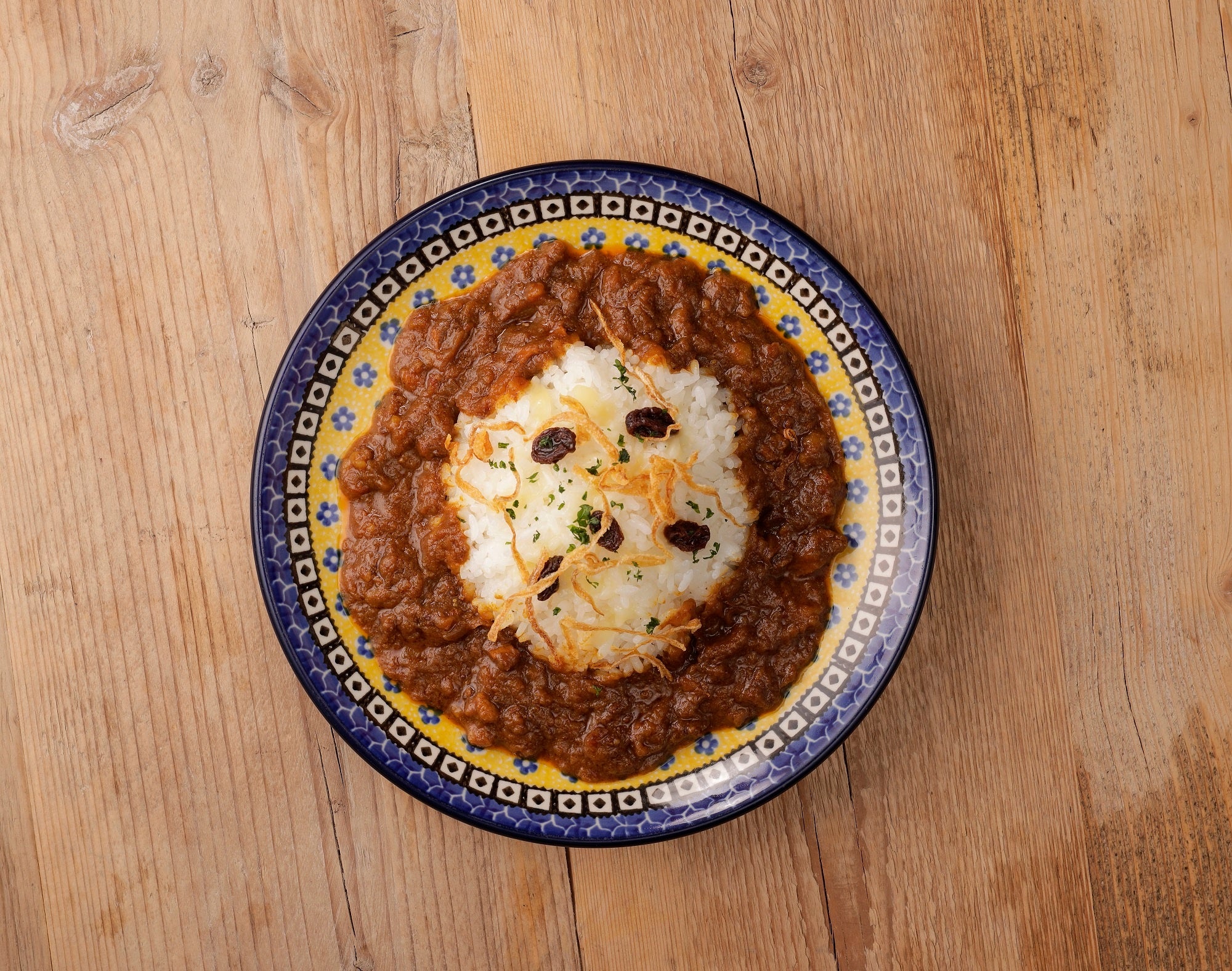 様々な香辛料をベースに、じっくり炒めたオニオンの甘み、あとからくるスパイスの程よい辛さのカレーです。