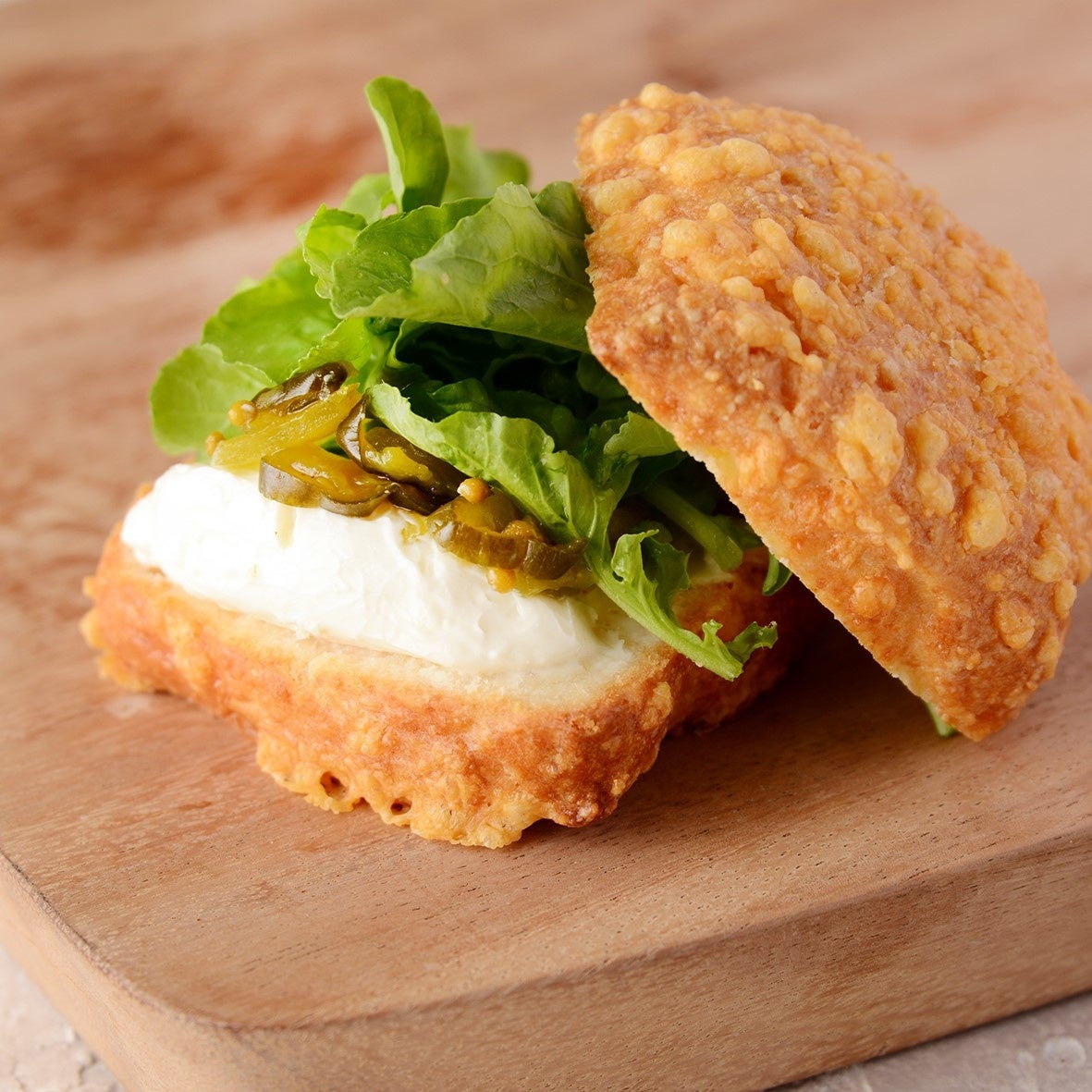 パルメザンチーズ・チェダー・ナチュラルチーズの3種を練り込み上からもミックスチーズをかけて焼き上げました。中にはルッコラ、スイートキューカンバーピクルス、クリームチーズをサンドしたセイボリースコーンです。