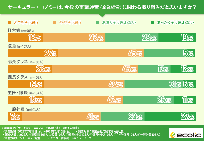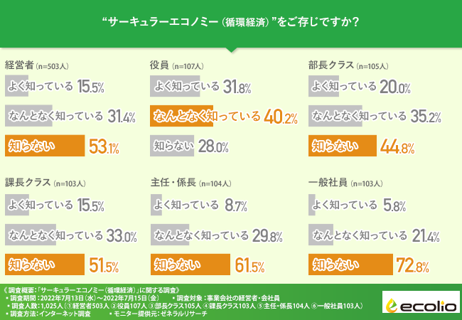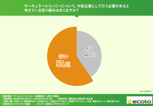 株式会社エコリオ(本社所在地:東京都千代田区、代表取締役:浦野 由紀夫)は、事業会社の経営者・会社員を対象に、「サーキュラーエコノミー(循環経済)」に関する調査を実施しました。