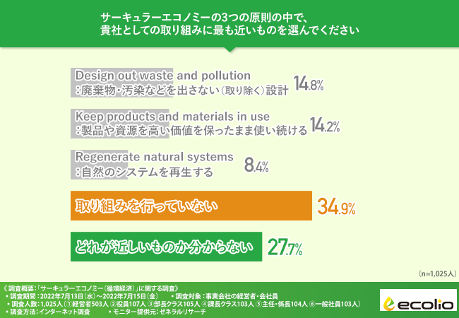 「サーキュラーエコノミーの3つの原則の中で、貴社としての取り組みに最も近いものを選んでください」と質問したところ、『Design out waste and pollution:廃棄物・汚染などを出さない(取り除く)設計(14.8%)』『Keep products and materials in use:製品や資源を高い価値を保ったまま使い続ける(14.2%)』『Regenerate natural systems:自然のシステムを再生する(8.4%)』『取り組みを行っていない(34.9%)』『どれが近しいものか分からない(27.7%)』という結果となりました。