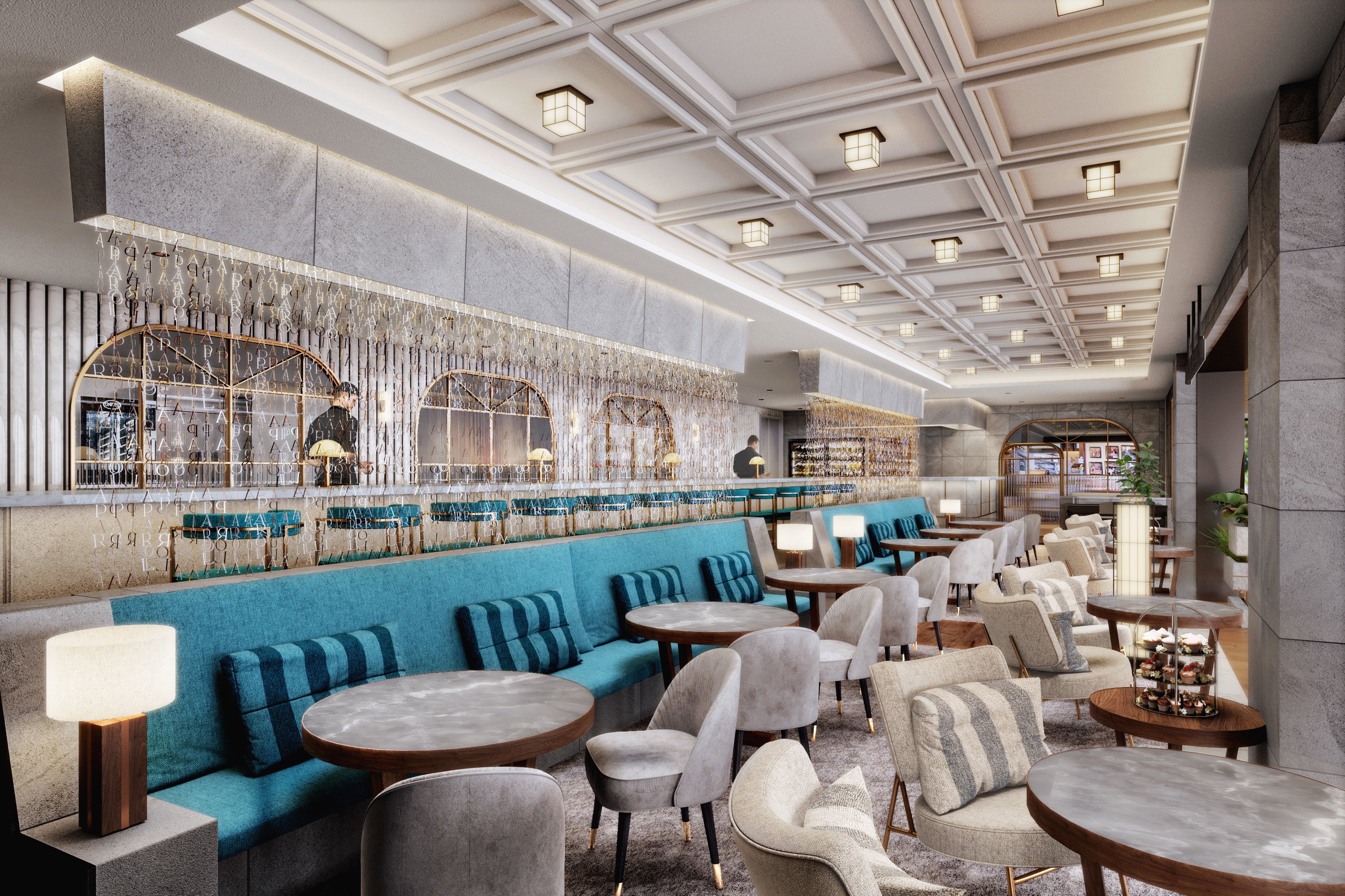 ターコイズブルーを基調にしたホテルのラウンジを思わせる店内では、地上30階からの絶景を目の前にスペシャリテ「洋梨のトロンプ・ルイユ」や個性派のデセール・セイボリーを盛り合わせた「カフェ・グルマン」を楽しめます。またランチ、ディナータイムには、シェフの出身地である本場フランス・ブルターニュのガレットをアラカルト・コースで提供するなど、食事利用も可能です。