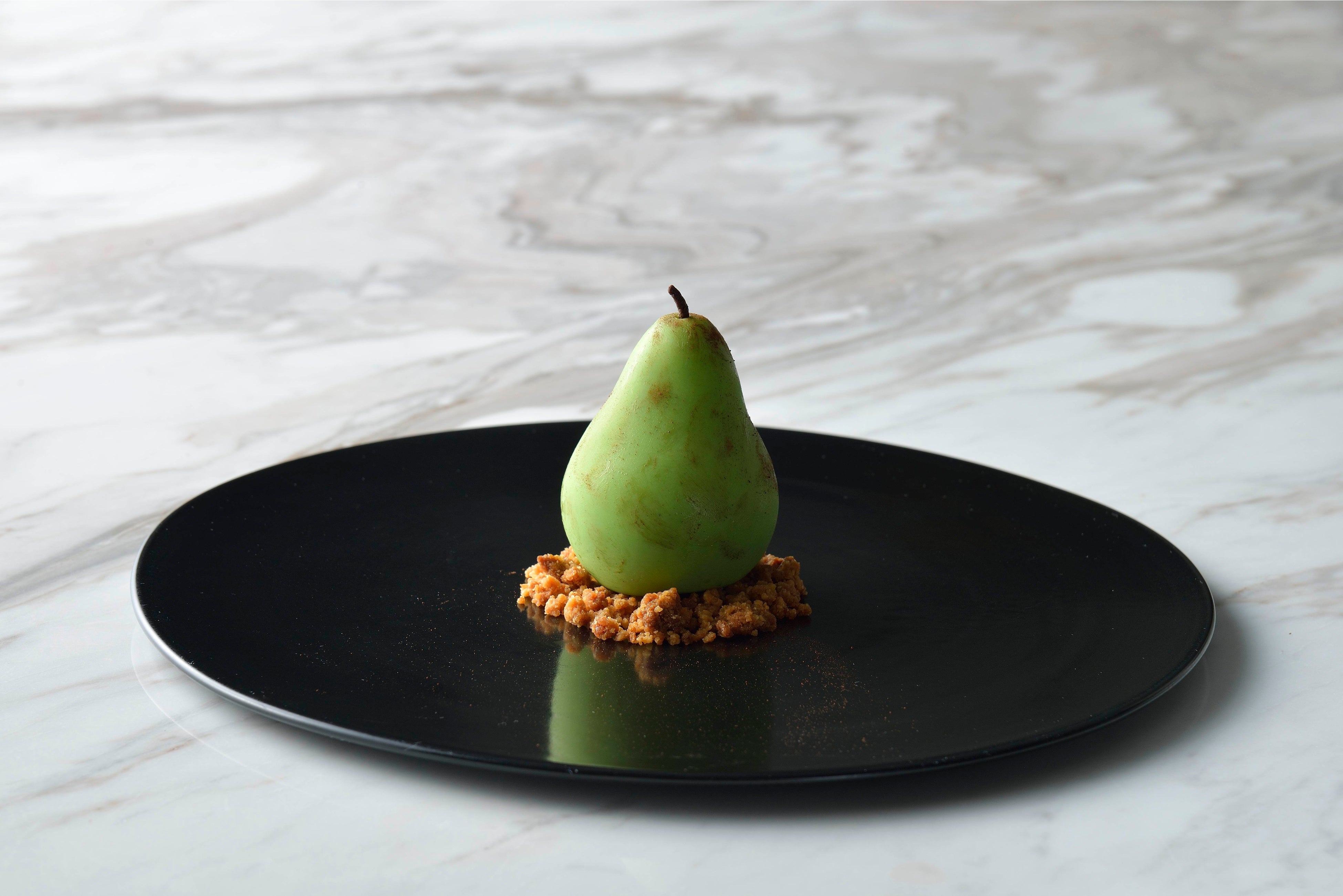 「Pâtisserie PAROLA」のスペシャリテ。まるでアート作品のような一皿は、国産の洋梨とフランボワーズのジュレを包んだ洋梨のムースを厚さ1mmのホワイトチョコでコーティングしました。洋梨の豊かな香りと優しい甘味、フランボワーズの酸味とのマリアージュ、またクランブルのザクザク食感とホワイトチョコのパリパリ食感も楽しめます。*フルーツは季節によって変動します。