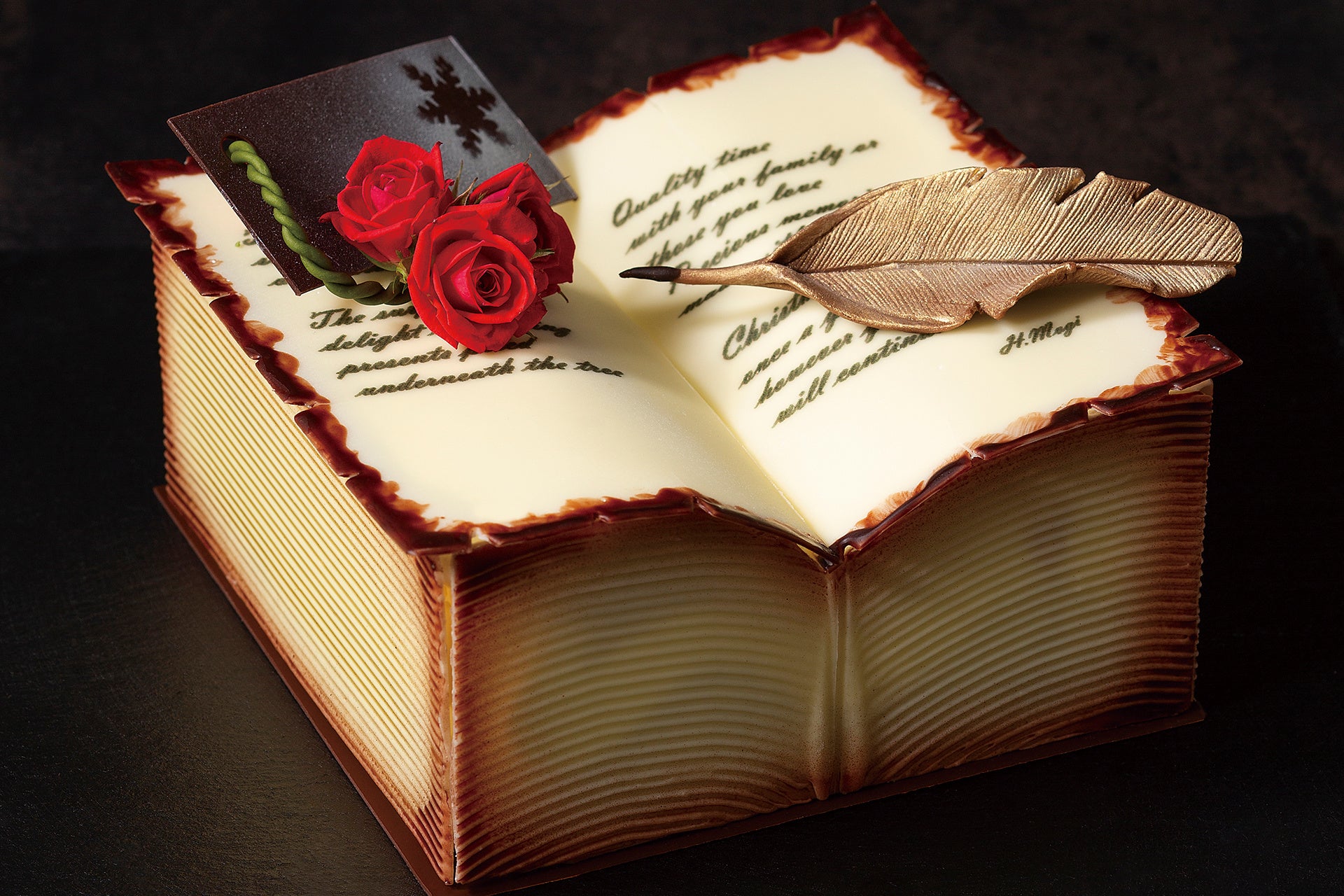 フィンランド語で「物語」の意味。チョコレートで出来た美しい本のページの下には、ベリーのジュレを合わせたピスタチオとマスカルポーネ、キャラメルとショコラの2種の異なる味わいが隠れています。口の中に広がる味わいや食感の違いが楽しいケーキです。雪の結晶がデザインされたブックマークとチョコレートの羽ペンが高級感を演出します。