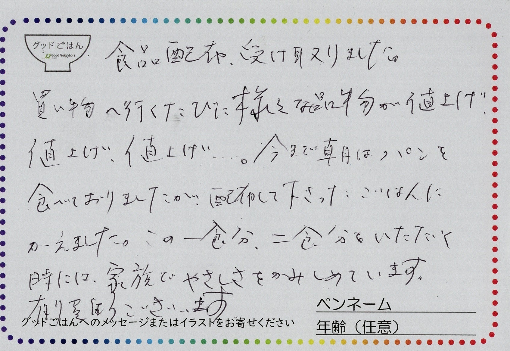 【「グッドごはん」利用者から届いたハガキ】