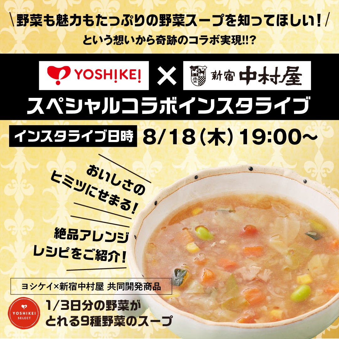 つくる人から笑顔に。をテーマに全国でミールキット宅配サービスを提供するヨシケイグループ(本部所在地:静岡県静岡市 / 代表取締役:井野口 雄一)は、調理済みでレンジや湯煎で手軽に食べられる、ヨシケイのオリジナルブランド「ヨシケイセレクト」のさらなるPRを実施。ヨシケイセレクト商品の中でご好評をいただいている「1/3日分の野菜がとれる9種野菜のスープ」のメーカーである、(株) 中村屋とのコラボプレゼントキャンペーンならびにヨシケイ公式インスタグラムアカウントにてインスタコラボライブを配信いたします。