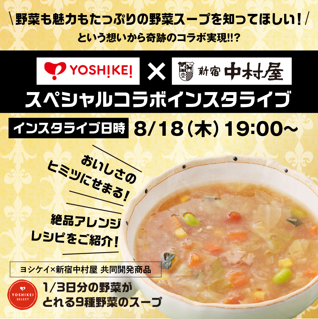 つくる人から笑顔に。をテーマに全国でミールキット宅配サービスを提供するヨシケイグループ(本部所在地:静岡県静岡市 / 代表取締役:井野口 雄一)は、調理済みでレンジや湯煎で手軽に食べられる、ヨシケイのオリジナルブランド「ヨシケイセレクト」のさらなるPRを実施。ヨシケイセレクト商品の中でご好評をいただいている「1/3日分の野菜がとれる9種野菜のスープ」のメーカーである、(株) 中村屋とのコラボプレゼントキャンペーンならびにヨシケイ公式インスタグラムアカウントにてインスタコラボライブを配信いたします。