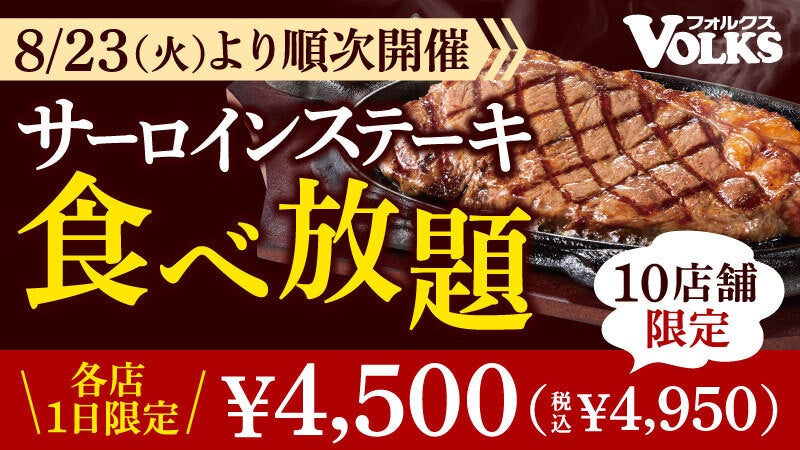 株式会社アークミール(本社:埼玉県さいたま市、代表取締役社長:柳 先)が運営する『フォルクス』では、2022年8月23日(火)から8月30日(火)まで順次、東京都・大阪府・兵庫県・福岡県の10店舗において、各店舗1日限定の「サーロインステーキ食べ放題」を実施いたします。