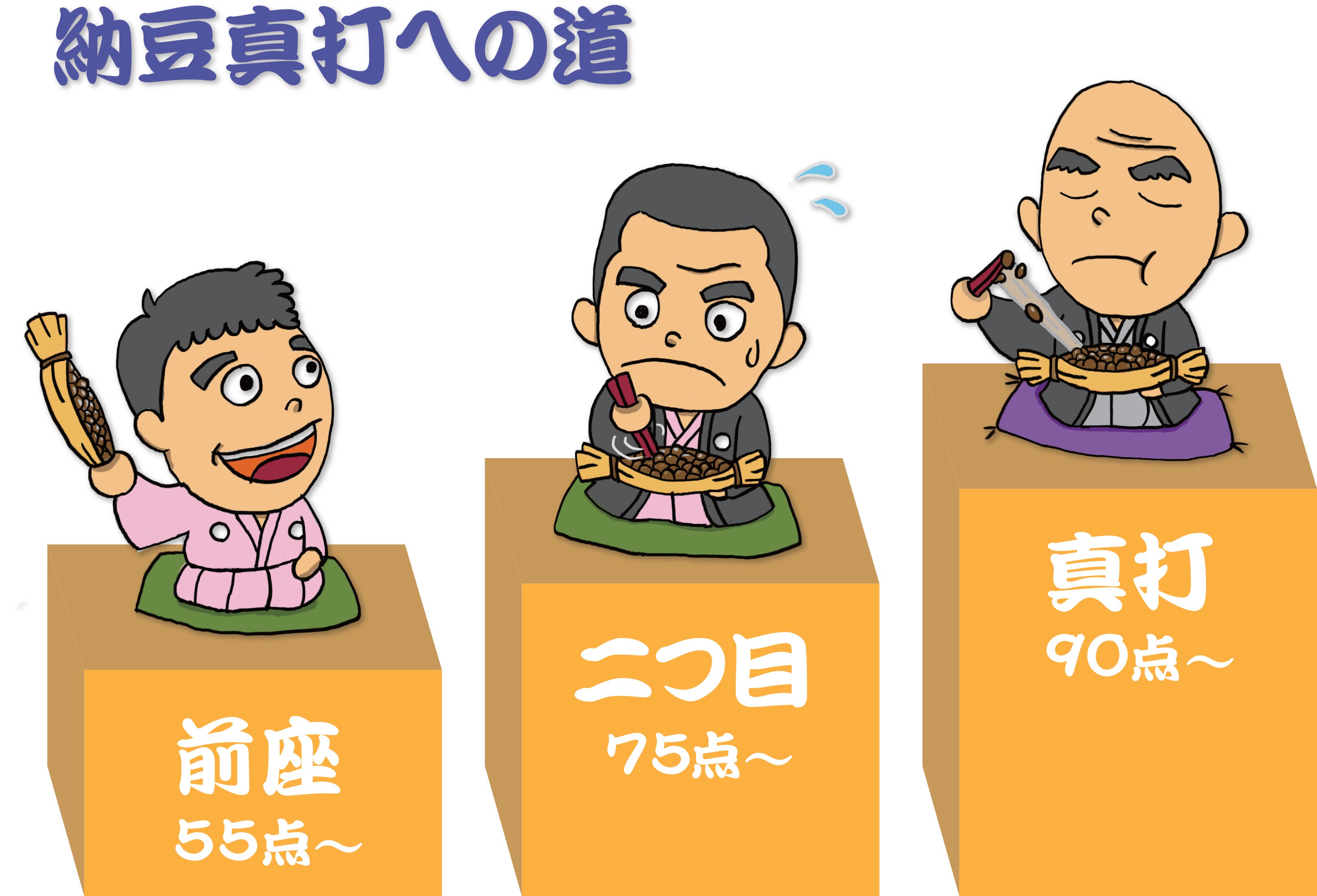 『納豆真打』は、「前座」、「二つ目」、「真打」と分かれており、試験の結果によって100点満点のうち、55点以上得点された方を「前座」、75点以上得点された方を「二つ目」、90点以上得点された方を「納豆真打」として認定します。真打合格者には、その証に認定書と「二つ目」に認定された方にはその証となるキーホルダー、「真打」には真打バッジを贈呈いたします。また、「真打」合格の最優秀者には、その年度に開催される全国納豆協同組合連合会主催の「全国納豆鑑評会」審査員として招待し、実際に全国の納豆を鑑評いただきます。