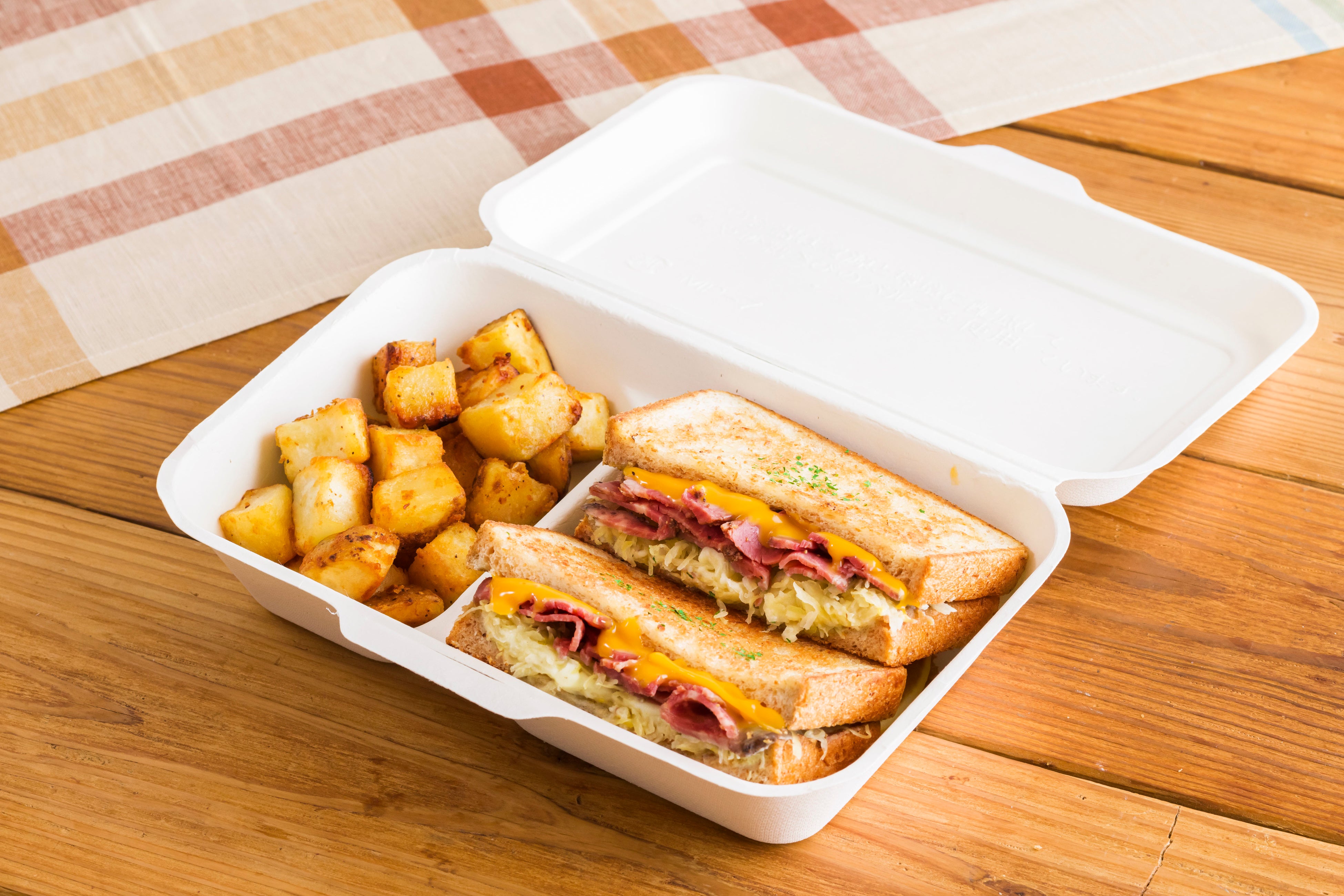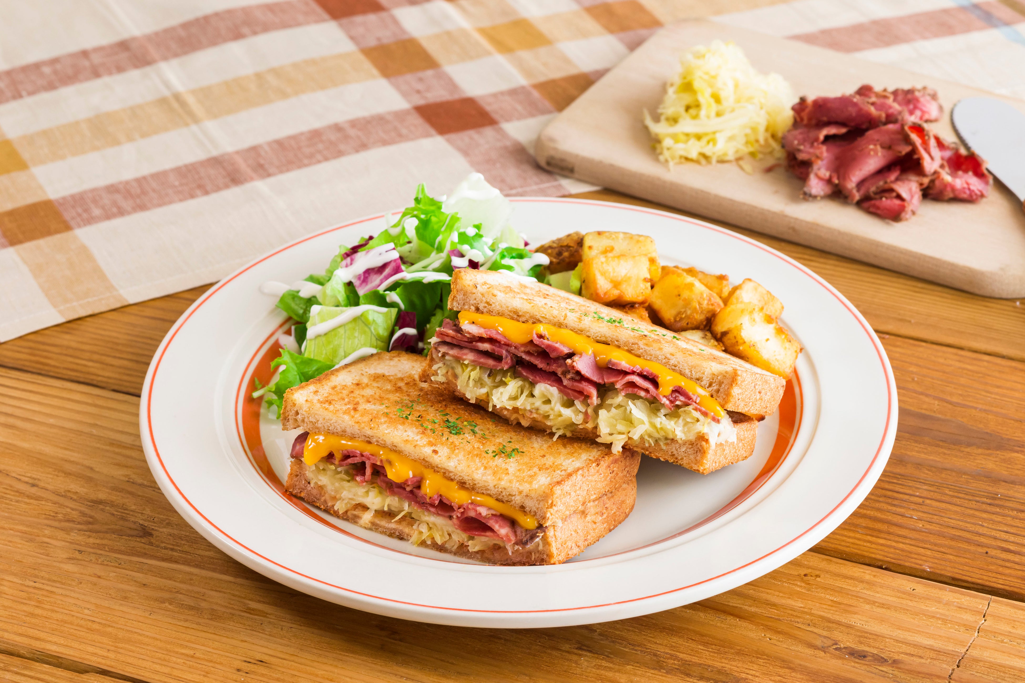 全粒粉のトーストにスパイスが効いたパストラミビーフを加えた一皿。ザワークラウトにマッシュポテト、チェダーチーズとご一緒にお楽しみください。