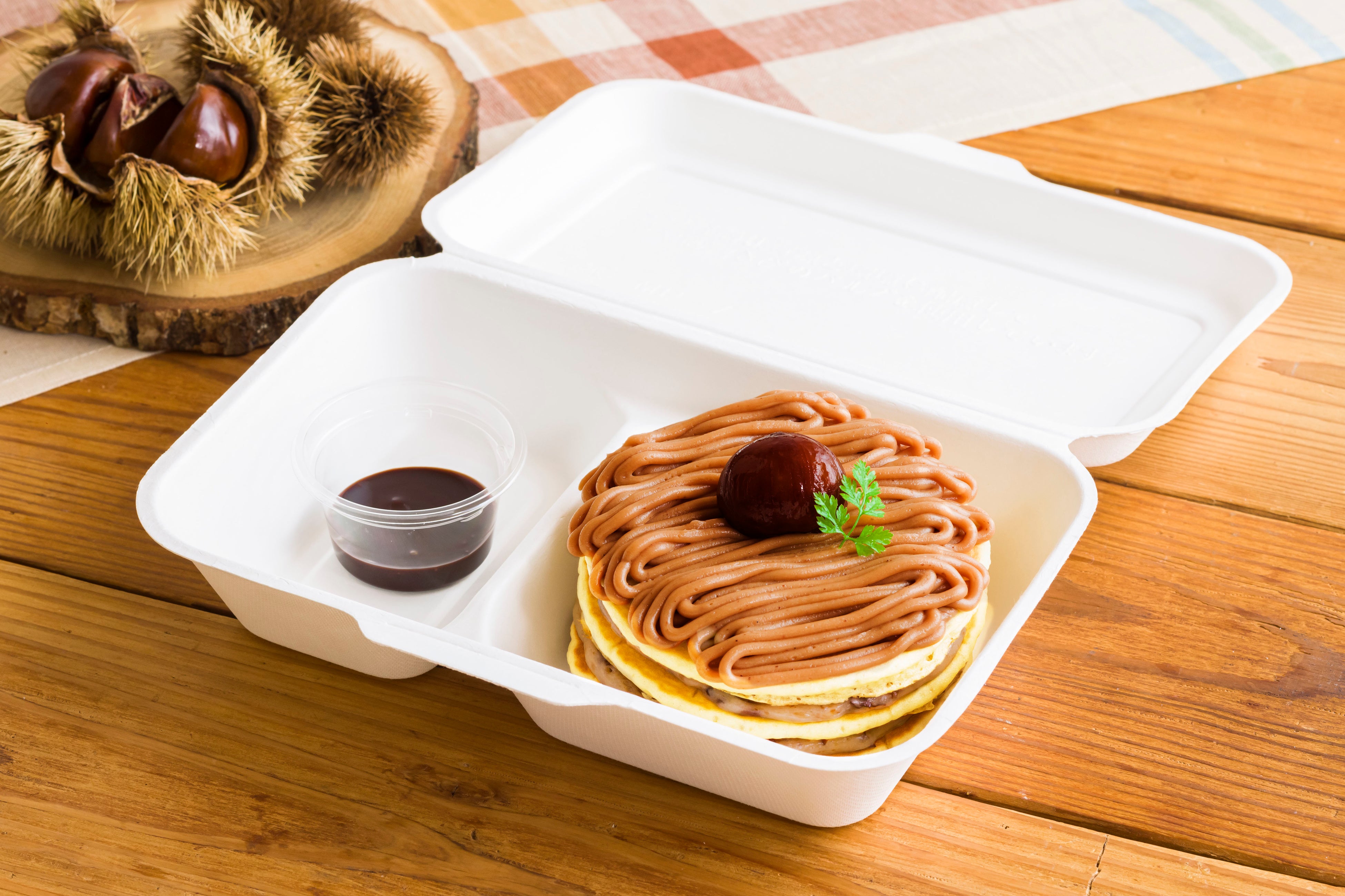 毎年人気のモンブランクリームをたっぷりのせたパンケーキ!生地に重ねたクリームは2種類の味から1つお選びいただけます。