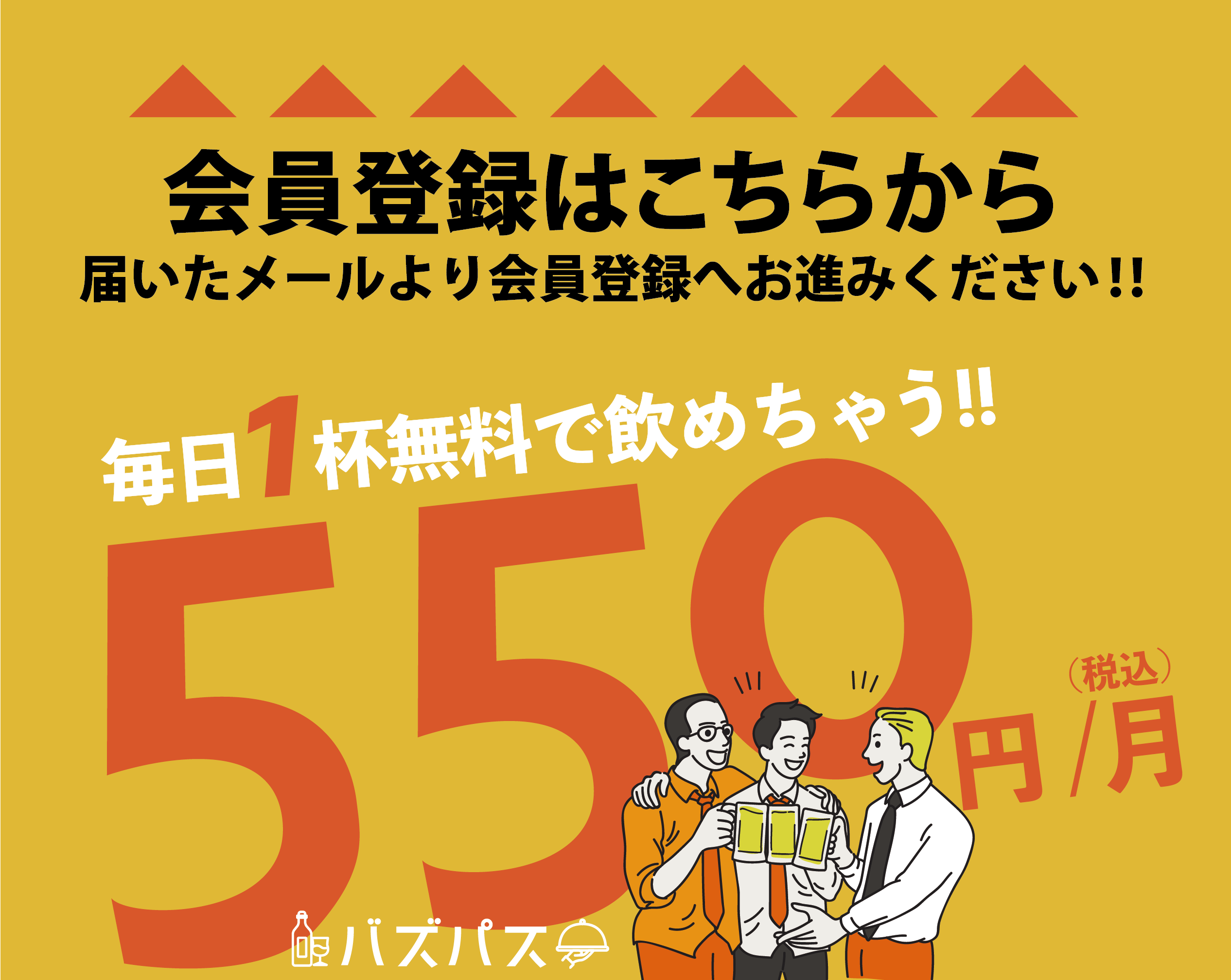 月額550円(税込)で、対象の飲食店にてドリンク1杯無料や料理1品無料などの特典を受けることができます。