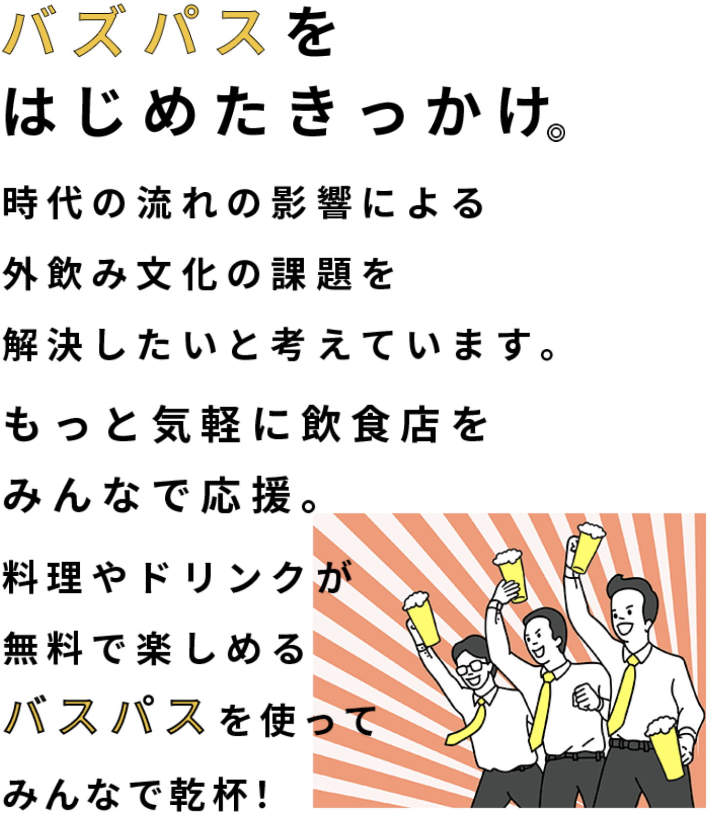 また、飲食店スタッフの雇用を下支えするためのサポートは何かを考え、バズパス会員売上の一部を飲食店に還元することを事業目的の一つとして、サービスをスタートいたしました。