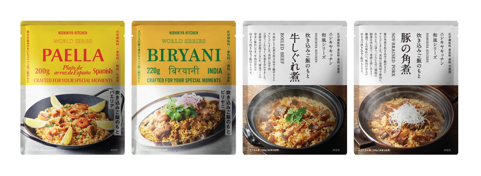 レトルト食品メーカー株式会社にしき食品(本社:宮城県岩沼市、代表取締役:菊池 洋)の自社ブランドNISHIKIYA KITCHEN(ニシキヤキッチン)は、炊き込みご飯のもとを4種類『パエリアのもと』『ビリヤニのもと』『牛しぐれ煮ご飯のもと』『豚の角煮ご飯のもと』を2022年8月18日(木)より発売いたします。炊き込みご飯を一から作るのは手間がかかりますが、レトルト食品に頼ればカンタン。お米と一緒に炊飯器で炊くだけで、本格的な世界の料理を楽しめます。