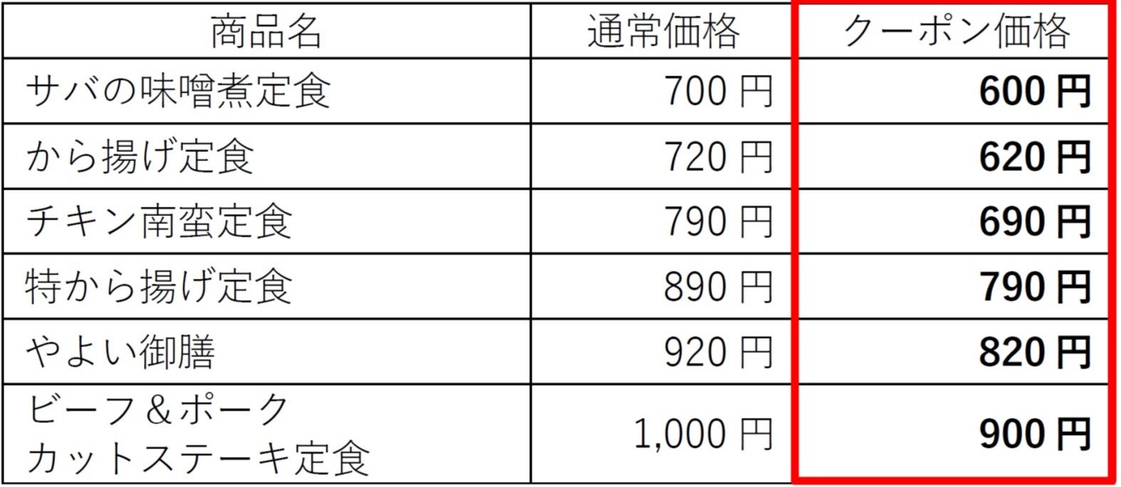 第1弾は、9月2日(金)10時より30日(金)までの期間中、『サバの味噌煮定食』600円や『から揚げ定食』620円、『チキン南蛮定食』690円などの6定食を、お得な特別価格でお楽しみいただけます。第2弾の配信もご期待ください。
