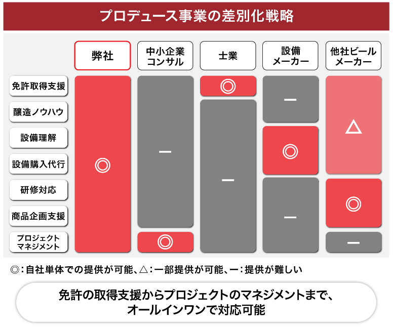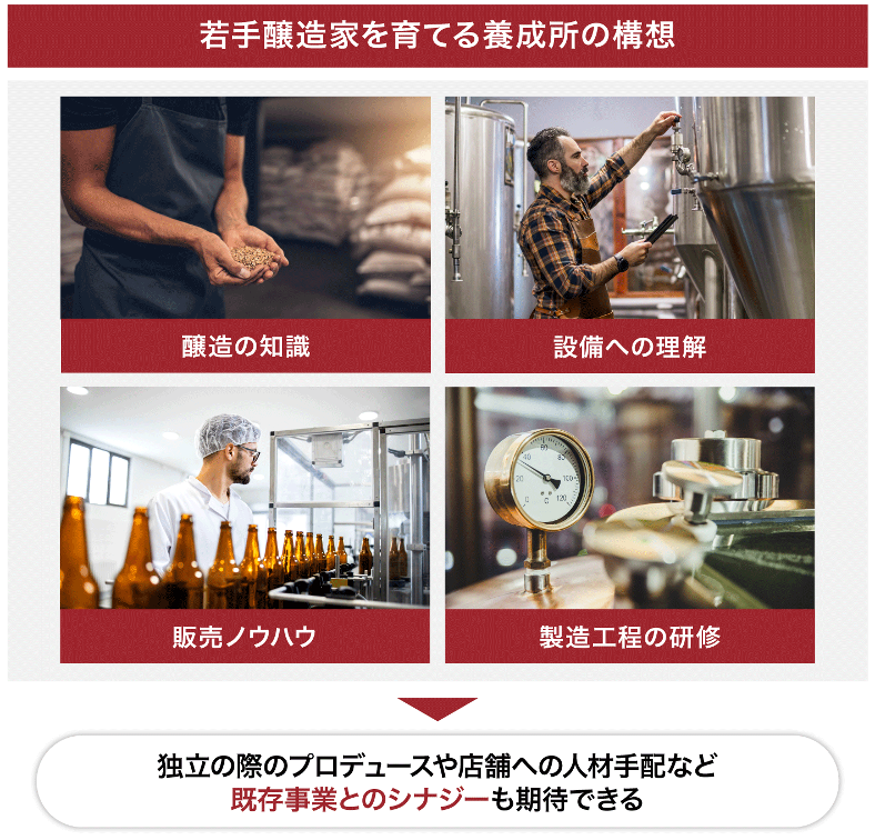 また、マイクロブルワリーのプロデュースにおいて、設備の手配や醸造技術の指導、免許取得、商品開発までをオールインワンでサポートするのも、弊社の特徴であるとともに強みのひとつであり、「設備の設置のみ」「商品企画のみ」を支援することは他社でもできますが、全てを一貫して行えるのは弊社のみだと自負しています。