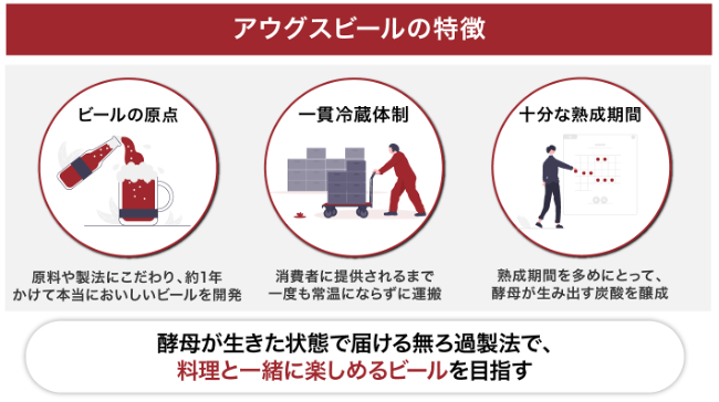 ・事業内容: 無ろ過生ビール「アウグスビール」の製造・販売、およびクラフトビール製造の支援・プロデュース