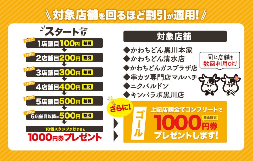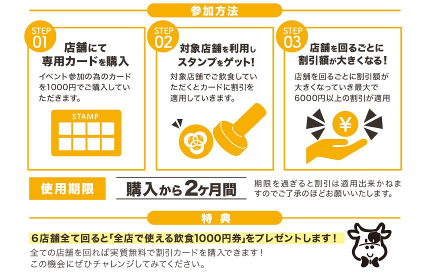 1店舗目100円割引、2店舗目200円割引、3店舗目300円割引、4店舗目400円割引、5店舗目以降500円割引。対象店舗全部回ると1000円割引券を必ずプレゼントします!期間は購入した日より2ヶ月間です。「グルメめぐりカード」は対象店舗にて8月17日(水)から販売いたします。